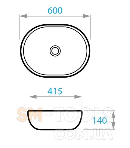 Накладний умивальник RN-0600-WB-MB має габаритні розміри (ВхШхГ) 14х60х41,5 см, овальну форму, рівні тонкі стінки та рівномірний матовий чорний колір.