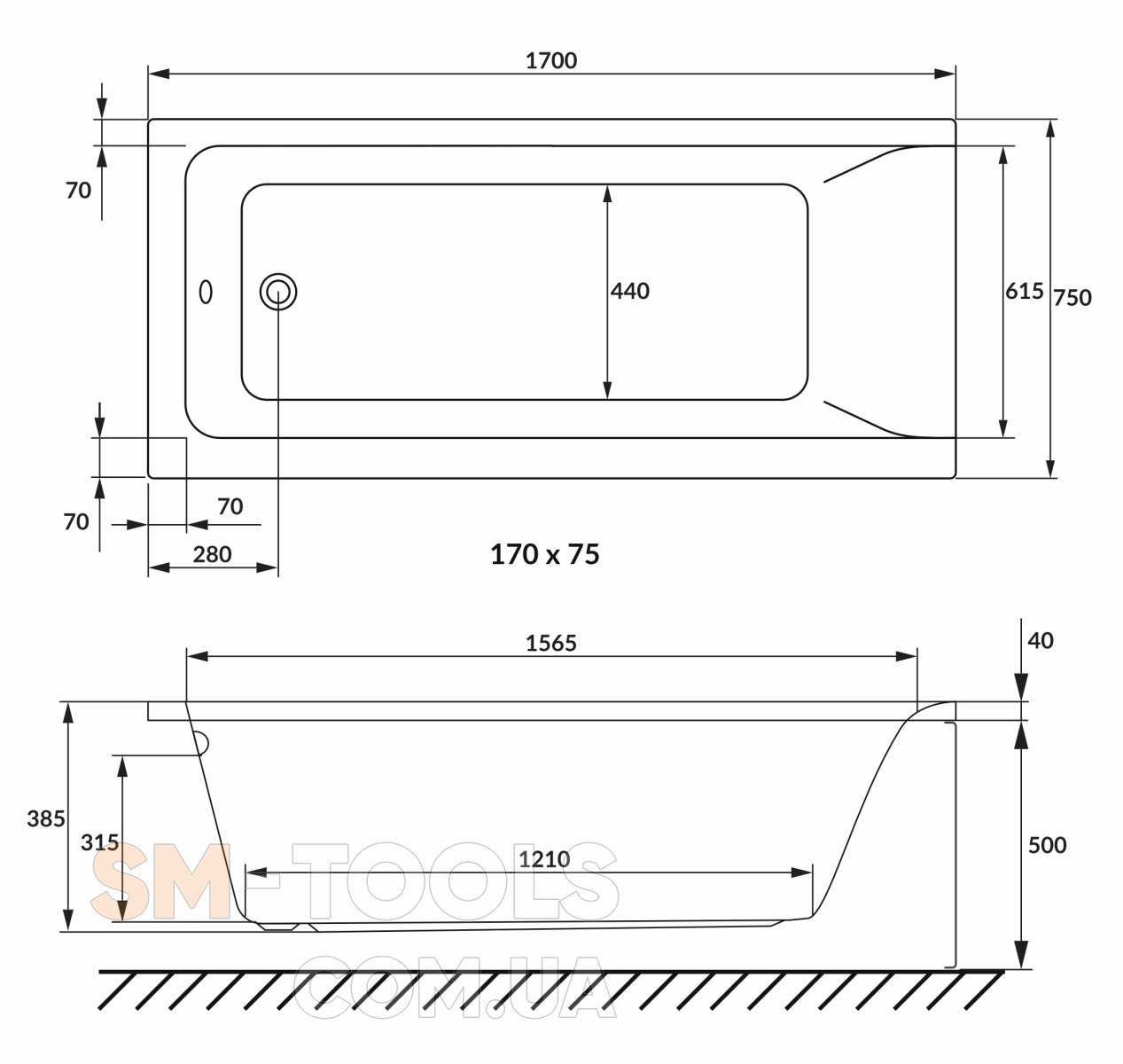 Ванна VOLLE SOLO 170*75*38,5см без ножек, акрил 5мм (1210.001775)