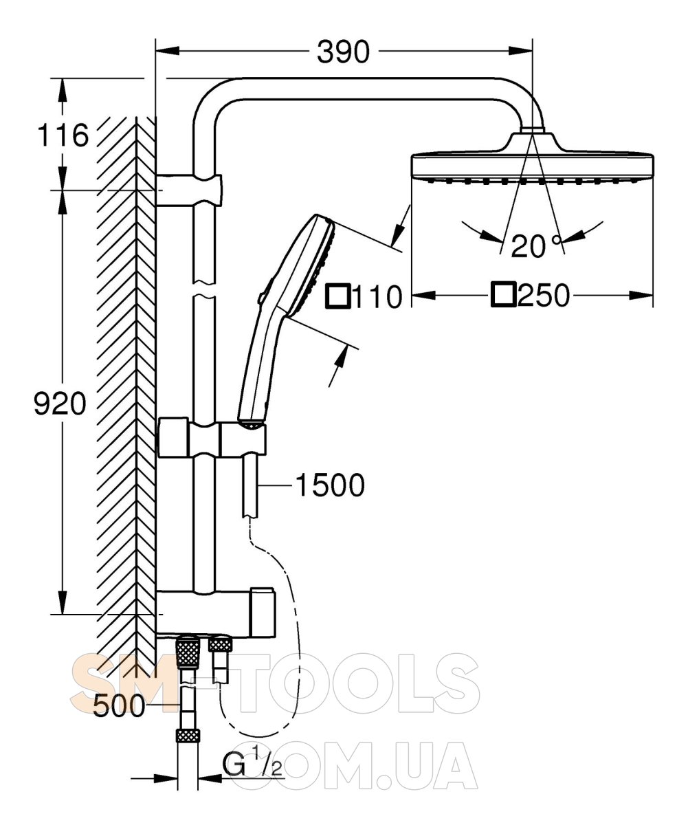 универсальный монтаж: подключение к смесителю/ до 500 мм душевого шланга с резьбой в 1/2"