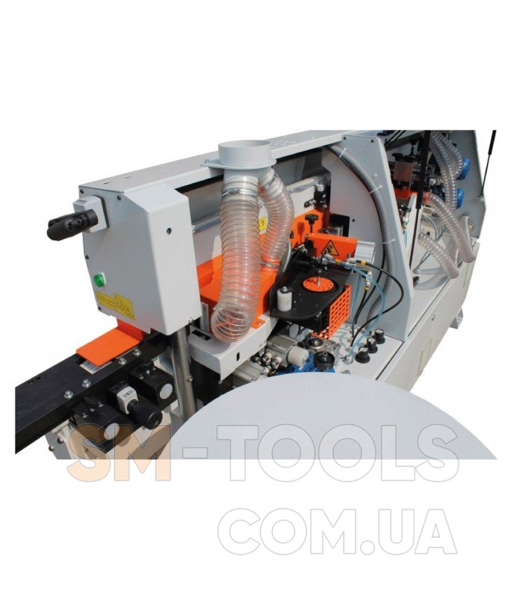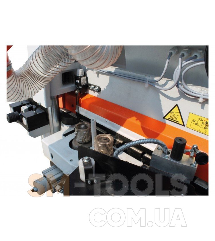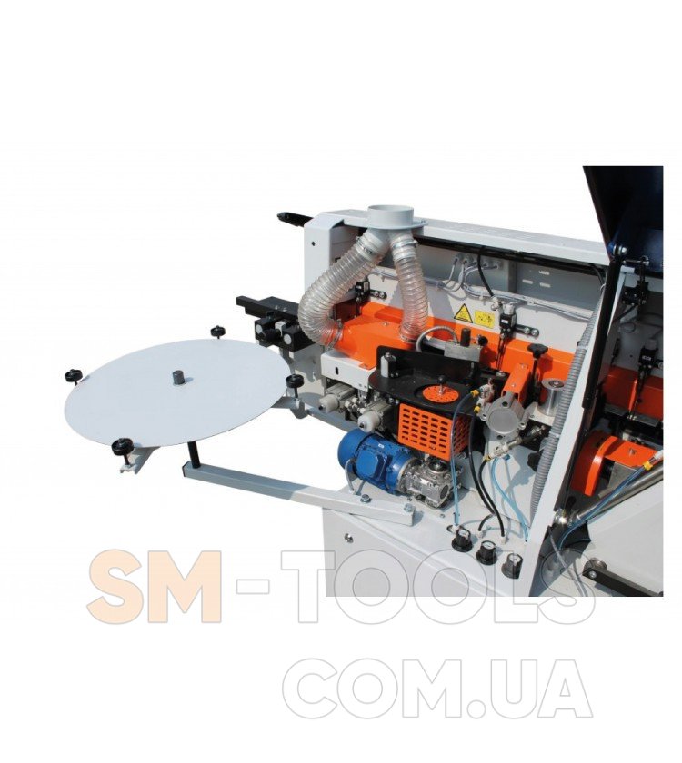 Мощность двигателей 0,55 кВт – фрезеровка кромки с припуском более 2 мм;Настройка узла производится с помощью счетчиков, что обеспечивает точность и простоту перенастройки;Круглые копиры большого диаметра Ø180 мм исключают повреждение любой облицованной поверхности.УЗЕЛ РАДИУСНОЙ ЦИКЛИ