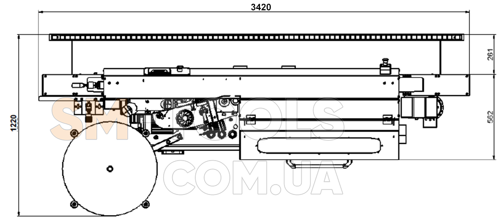 Деталь подается цепным конвейером с обрезиненными башмаками. Ширина башмаков 73 мм. Привод-мотор-редуктор 2,2 кВт VARVEL.