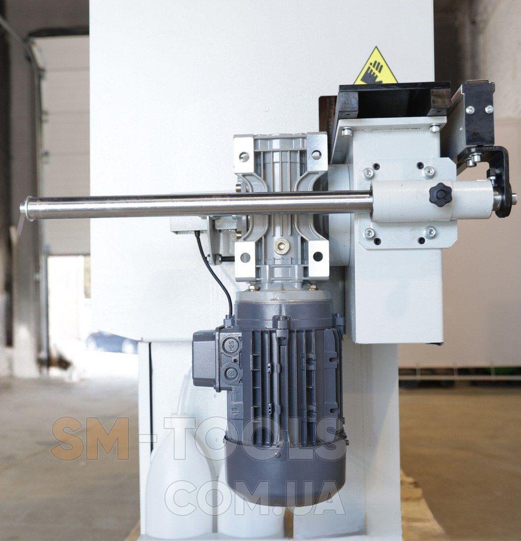 Деталь подается цепным конвейером с обрезиненными башмаками. Ширина башмаков 73 мм. Привод-мотор-редуктор 2,2 кВт VARVEL.