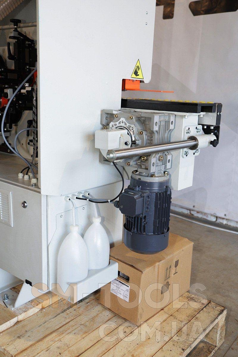 Настройка узла производится с помощью счетчика, что обеспечивает точность и простоту перенастройки; Антистатическое покрытие роликов гарантирует чистую поверхность кромочного материала и равномерный прижим кромки; Коническая форма второго и третьего роликов обеспечивает качественную приклейку кромки даже без предварительного фрезерования.