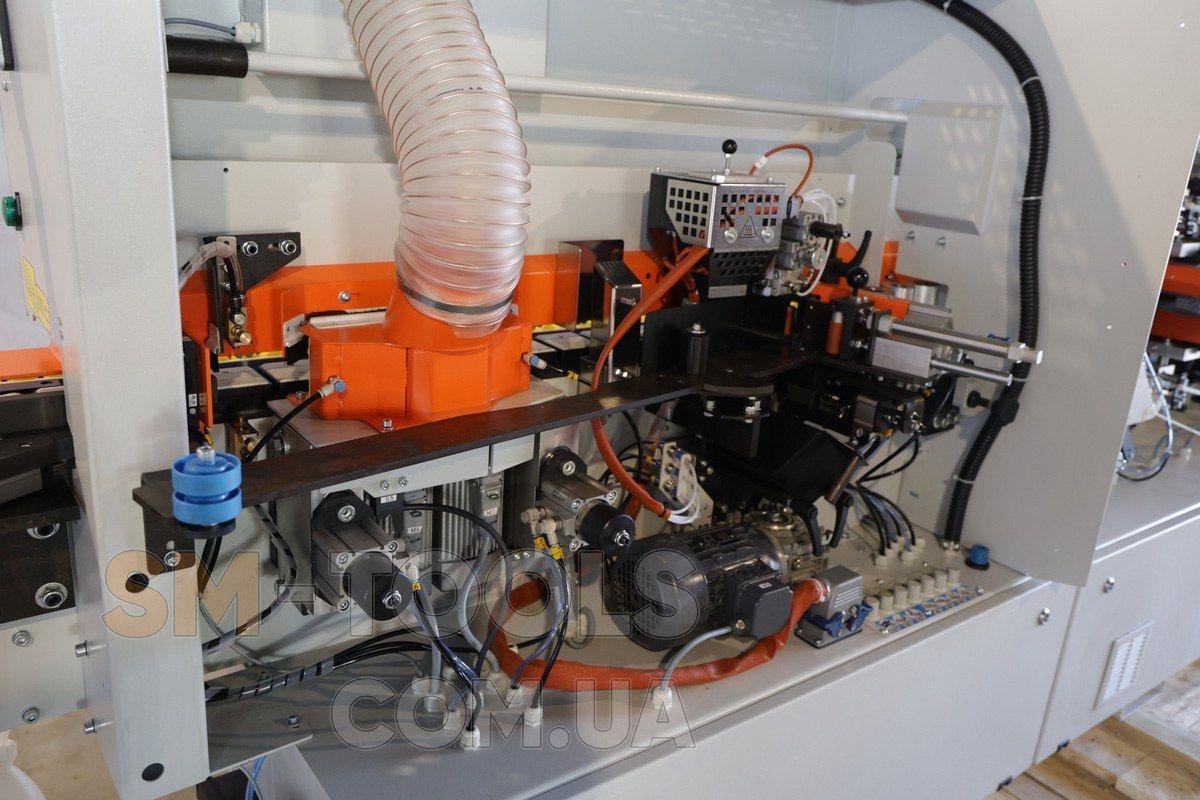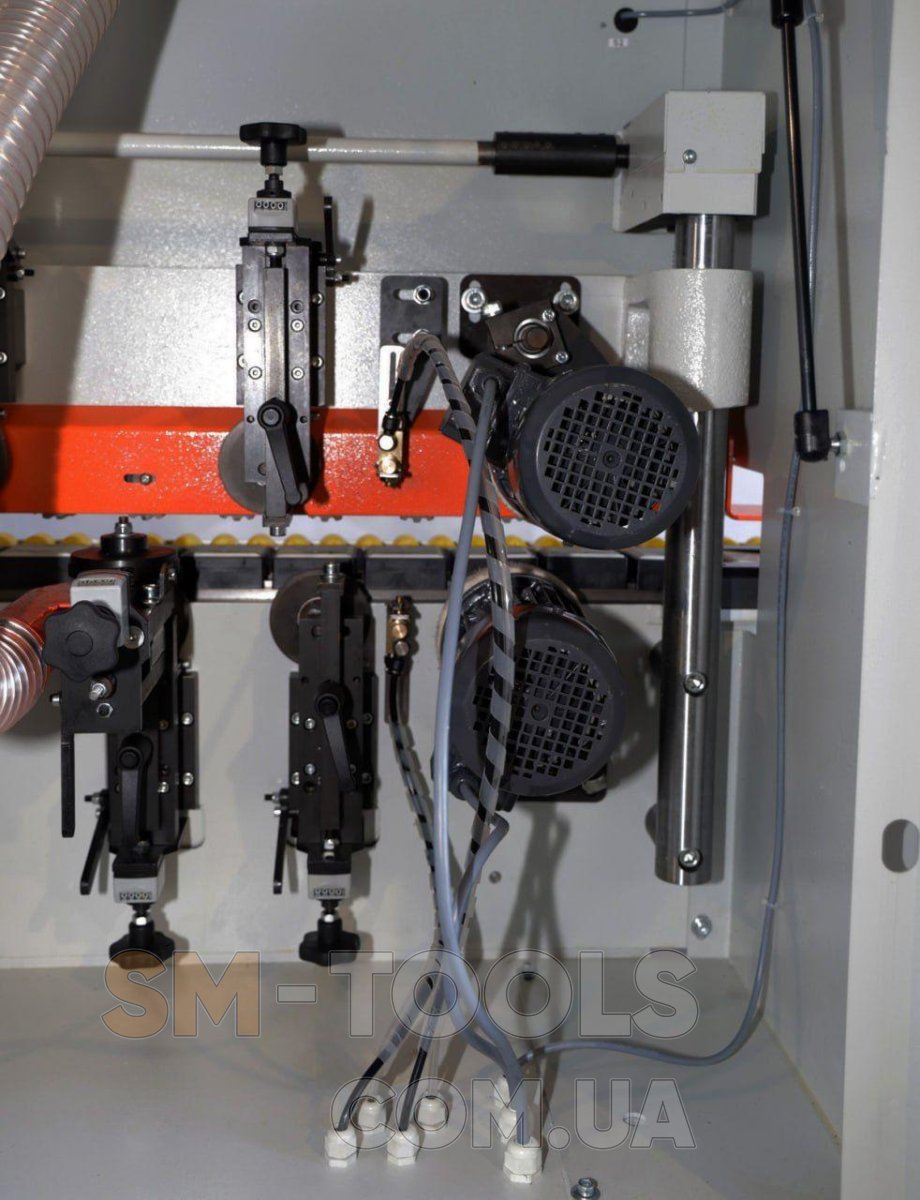 Мощность двигателей 0,55 кВт – фрезеровка кромки с припуском более 2 мм; Настройка узла производится с помощью счетчиков, что обеспечивает точность и простоту перенастройки; Круглые копиры большого диаметра ?180 мм исключают повреждение любой облицованной поверхности.
