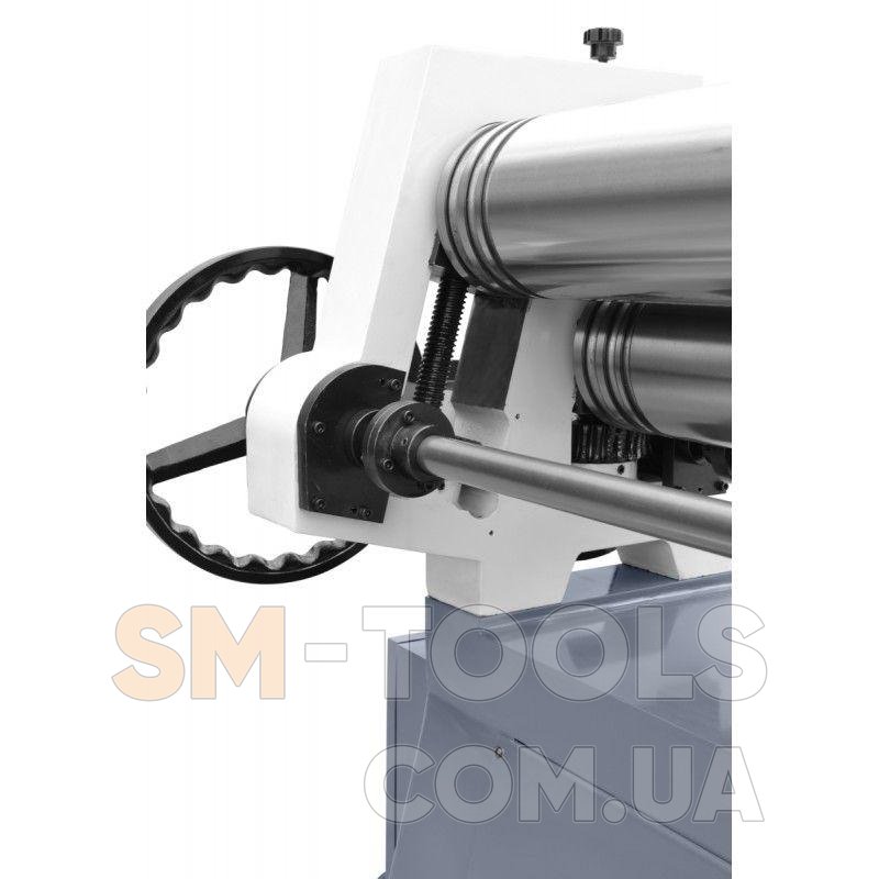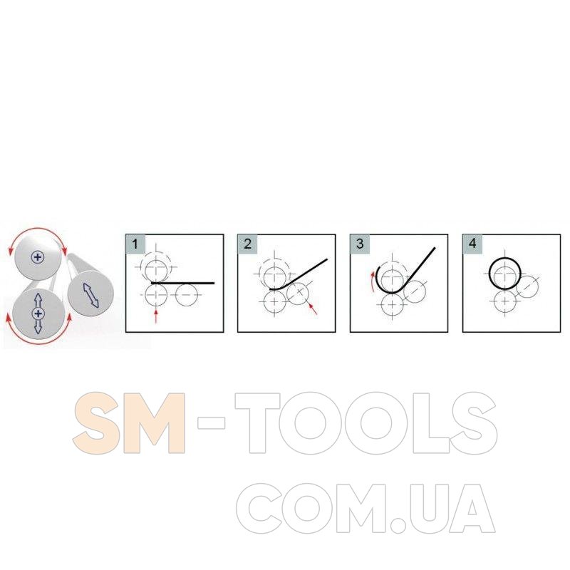 Асимметричная система вальцов Нижний и верхний вальцы вращаются с помощью системы шестерен и цепного привода от электродвигателя Верхний ролик вращается в обоих направлениях, оснащен механизмом наклона и поворота Нижний и боковые вальцы регулируются по высоте (вручную) Возможно сгибание конуса Ножное управление с кнопкой аварийной остановкиСхема обработки: