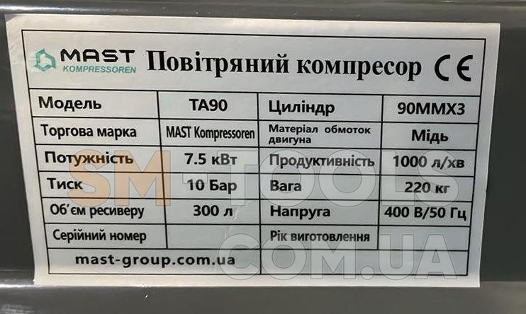 Поршневой компрессор Mast TA90/300L 400V - это надежный и эффективный компрессор, предназначенный для обеспечения сжатым воздухом различных пневматических инструментов и оборудования. Он идеально подходит для использования в мастерских, гаражах и для домашнего применения. Важным моментом в данном компрессоре есть медные обмотки на двигателе, существенно повышают надежность и безотказность в работе данного компрессора.