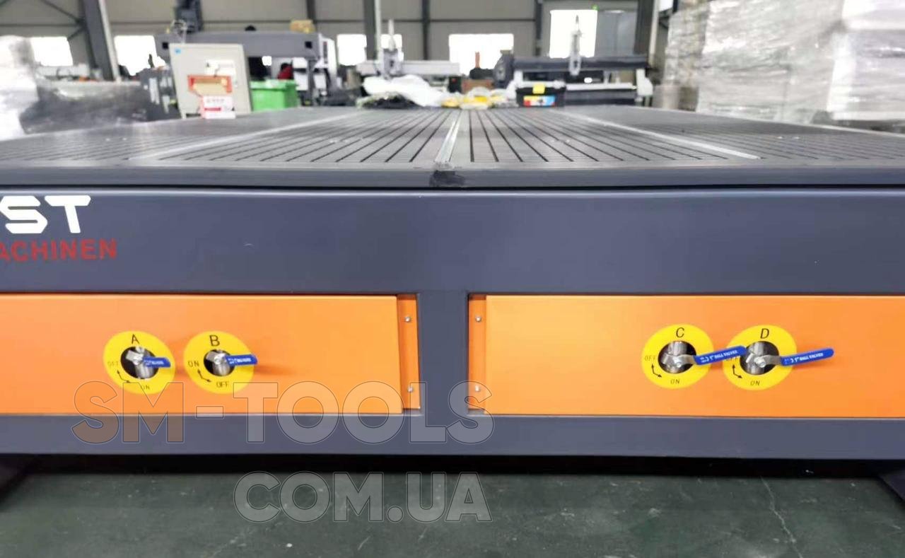 Рабочий стол станка является синтезом вакуумного стола и алюминиевого стола из «Т» – пазами. Такая конструкция дает максимальную гибкость и наиболее широкие возможности при выборе способа фиксации заготовки. Вакуумный стол разбит на четыре зоны для удобства фиксации деталей разных габаритов. Все модели станков с возможностью вакуумной крепи заготовок имеют специальную конструкцию стола, который позволяет крепить заготовку как с помощью вакуума, так и с помощью механических зажимов. Это позволяет отключить вакуумный насос и экономить электроэнергию в случае обработки частого изменения ненуждающихся заготовок или обгонки по периметру заготовки. Вакуумный стол производится из цельного листового материала, в котором фрезеруются пазы под алюминиевый профиль для крепления механических зажимов (струбцин). В этой конструкции отсутствуют какие-либо переклейки, что гарантирует стабильность работы вакуумного стола в течение всего срока службы оборудования.