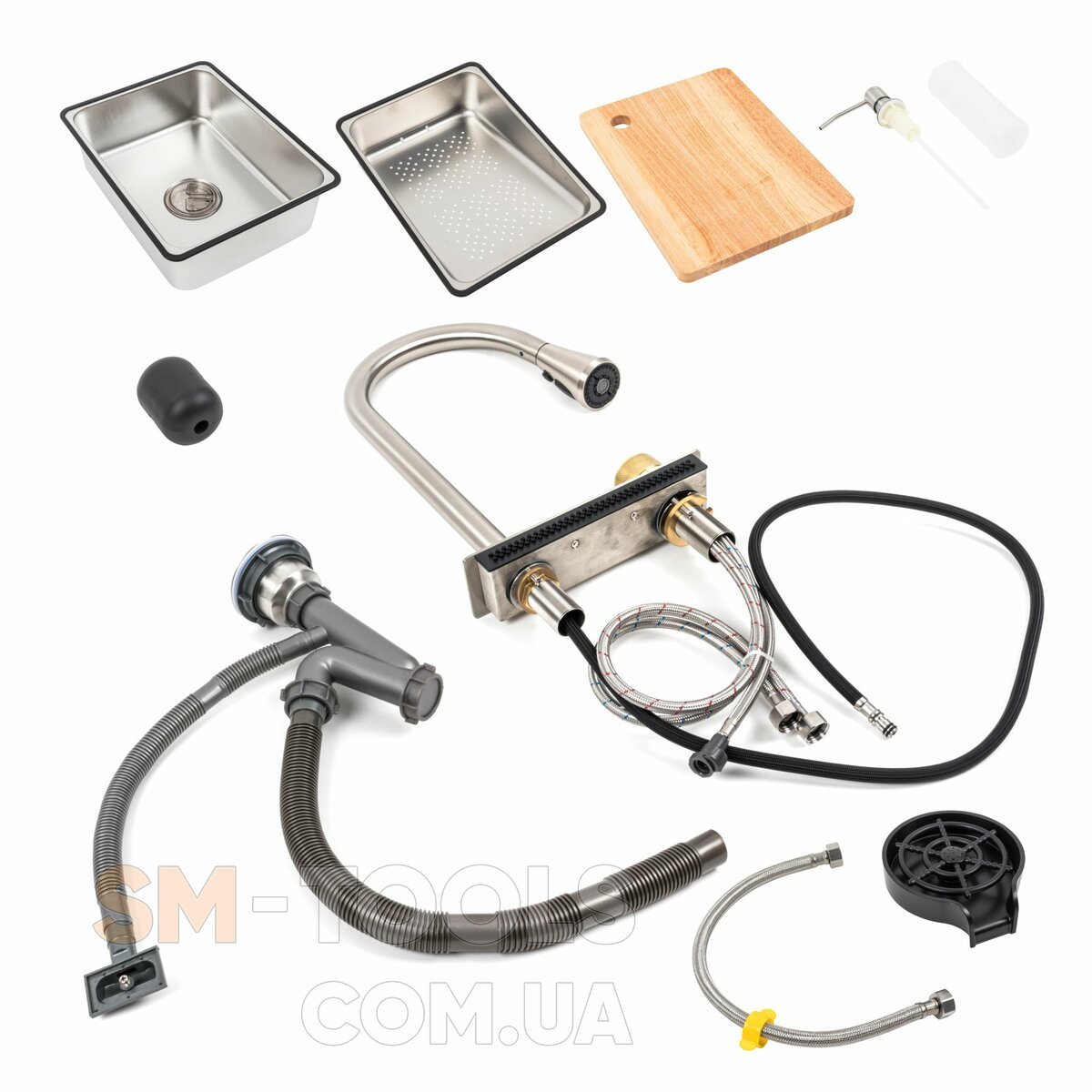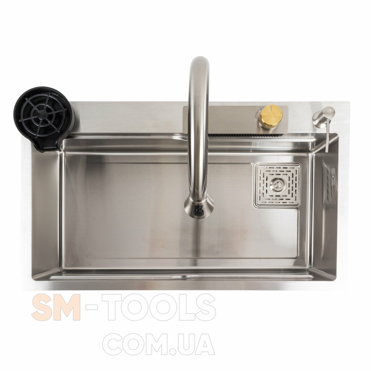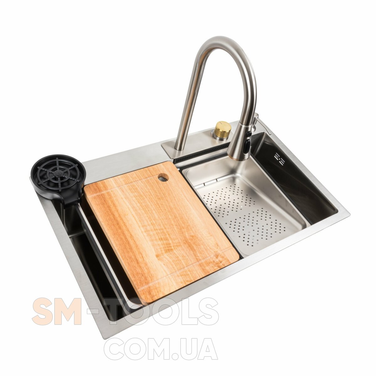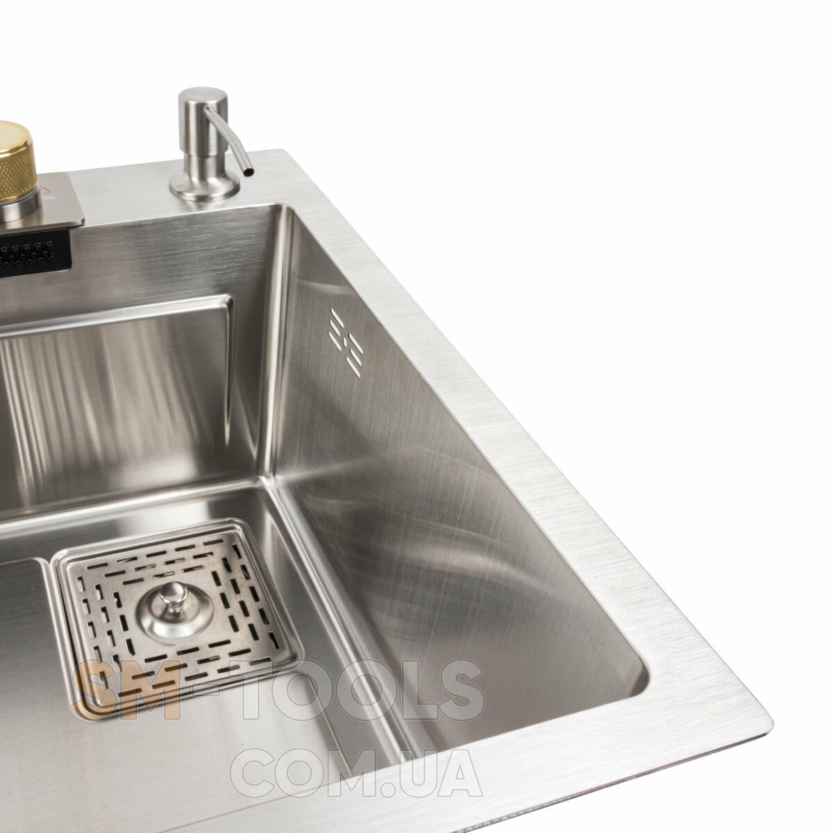 Кухонная мойка 75*45B PVD сатин Platinum Handmade "ВОДОСПАД" - невероятно популярная кухонная мойка, настоящее открытие в этом году! Ее многофункциональность и комплектация со смесителем делают ее незаменимым аксессуаром для любой кухни. Смеситель выдвижной с душем, а также имеет удобный режим водопада, что позволяет комфортно мыть фрукты, овощи и зелень. Мойка изготовлена из высококачественной нержавеющей стали SUS 201 с покрытием PVD, что обеспечивает ей особую прочность и стойкость к коррозии.