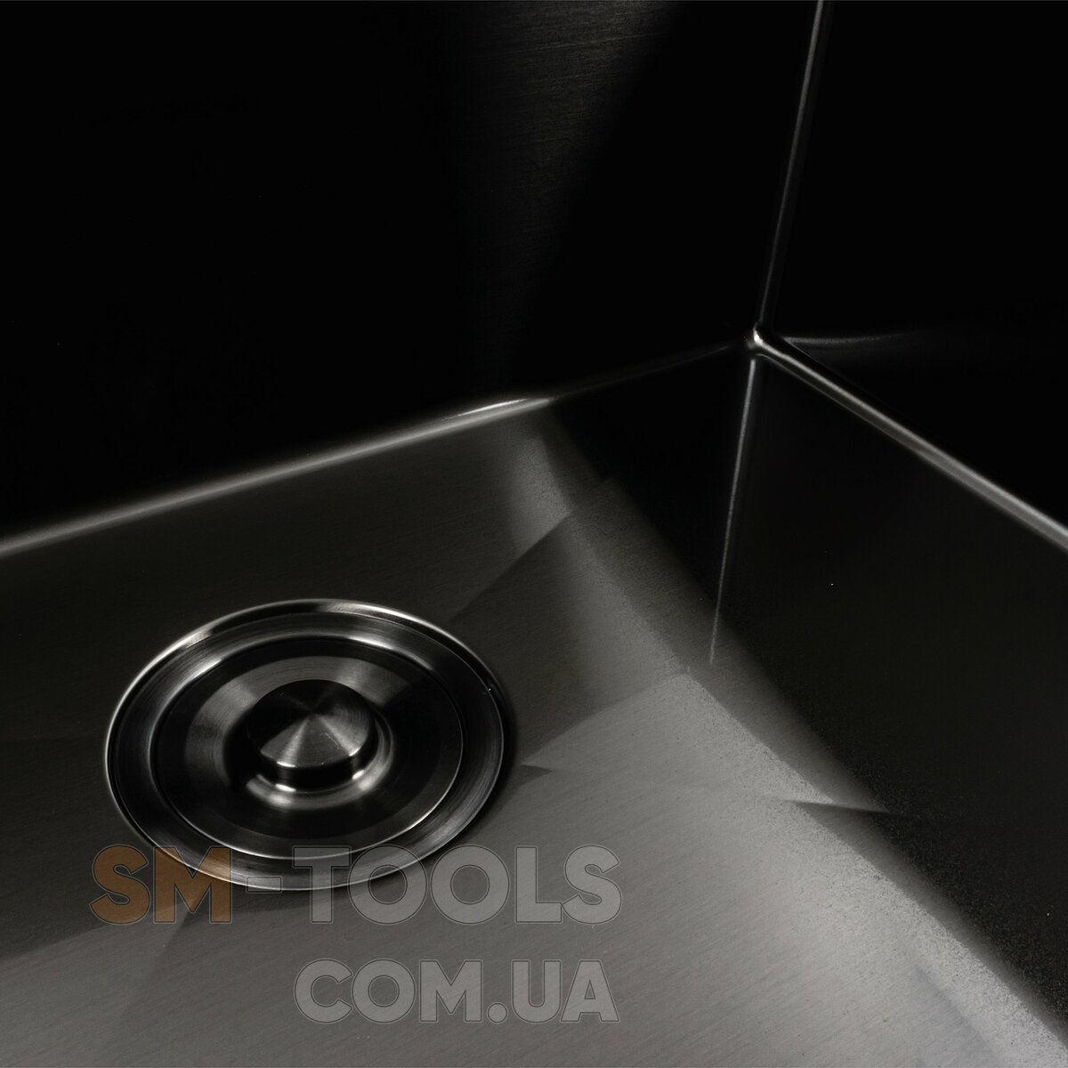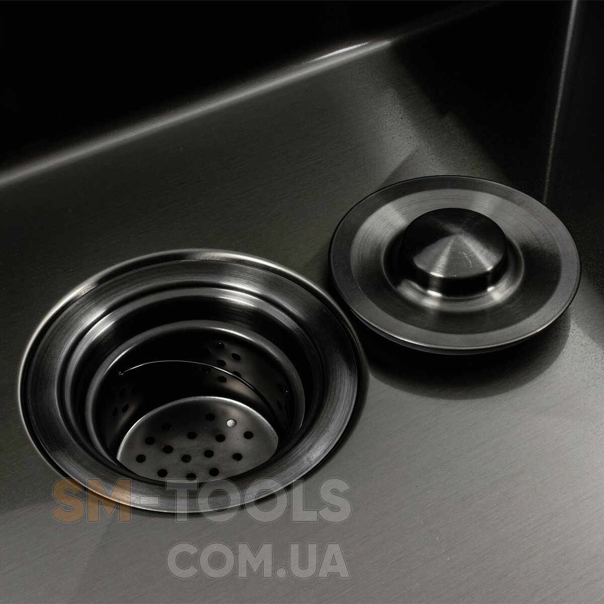 Она не остается там! Благодаря подключению к сифону, она сразу оттекает в трубу! Выберите кухонную мойку черную PVD 60х50 Platinum Handmade с подставкой для ножей и наслаждайтесь комфортом и стилем в каждой детали вашего кулинарного опыта!