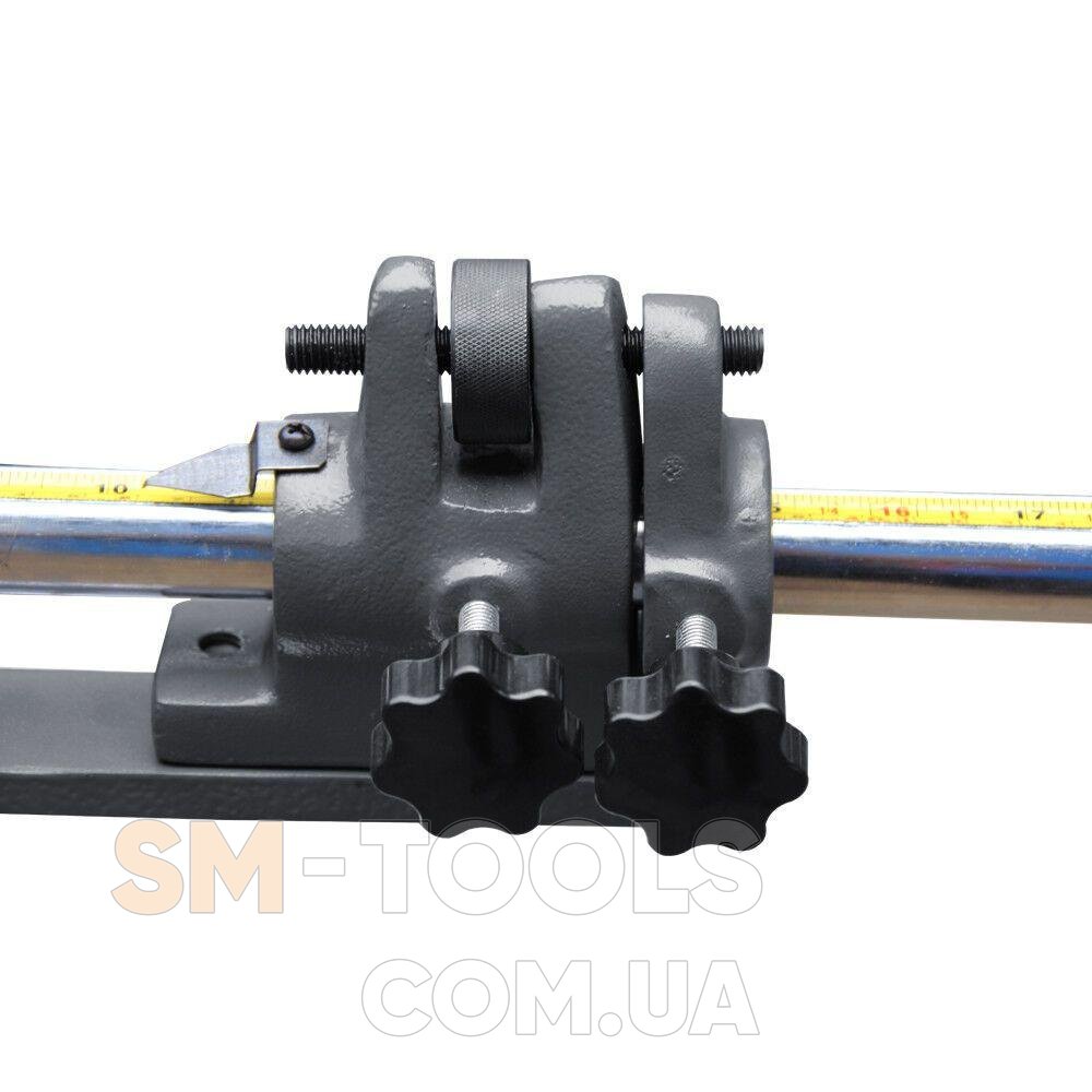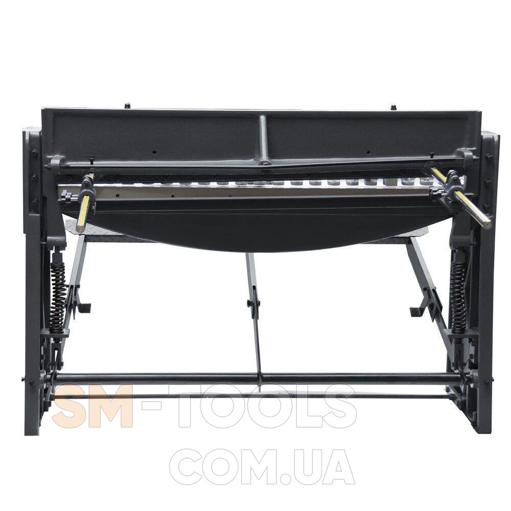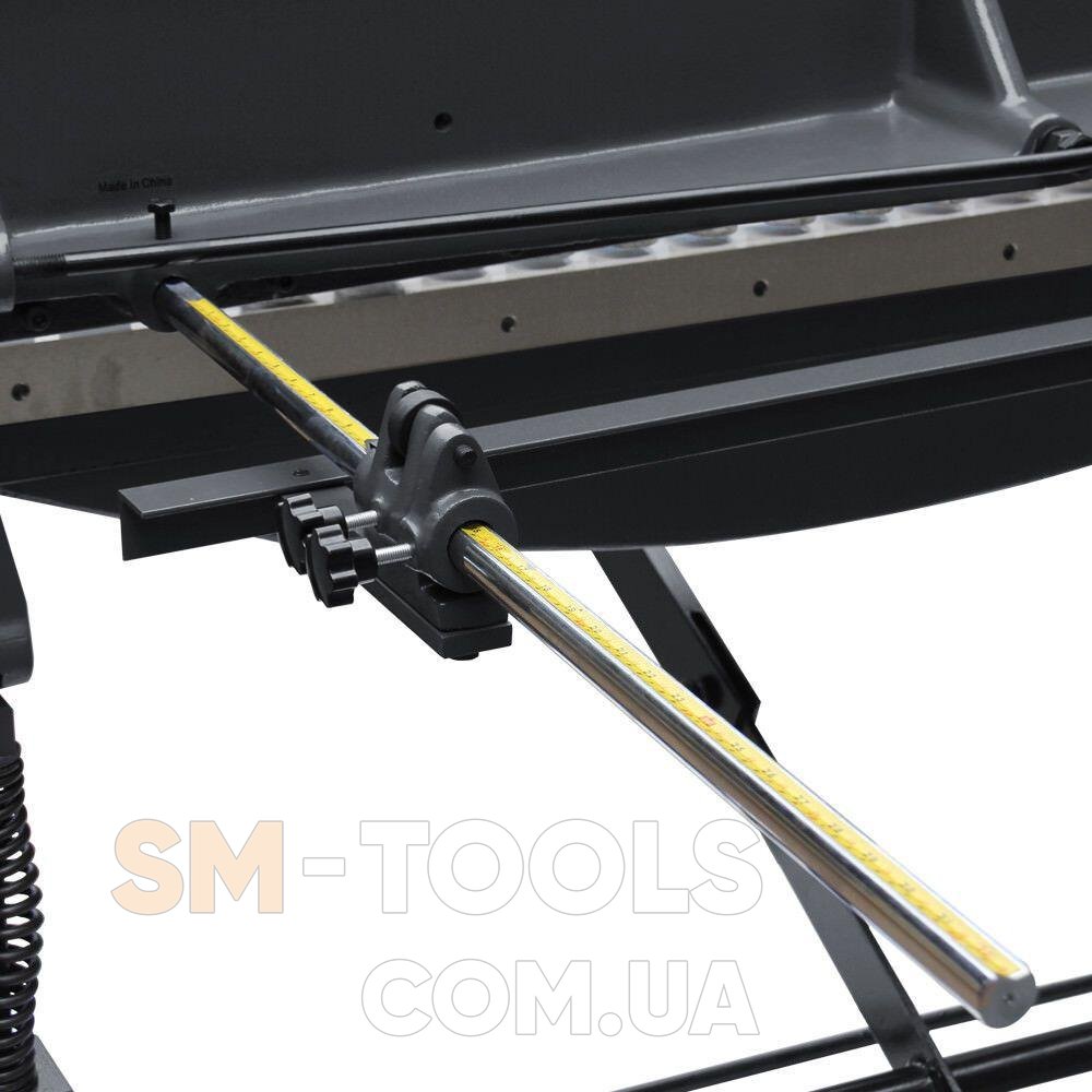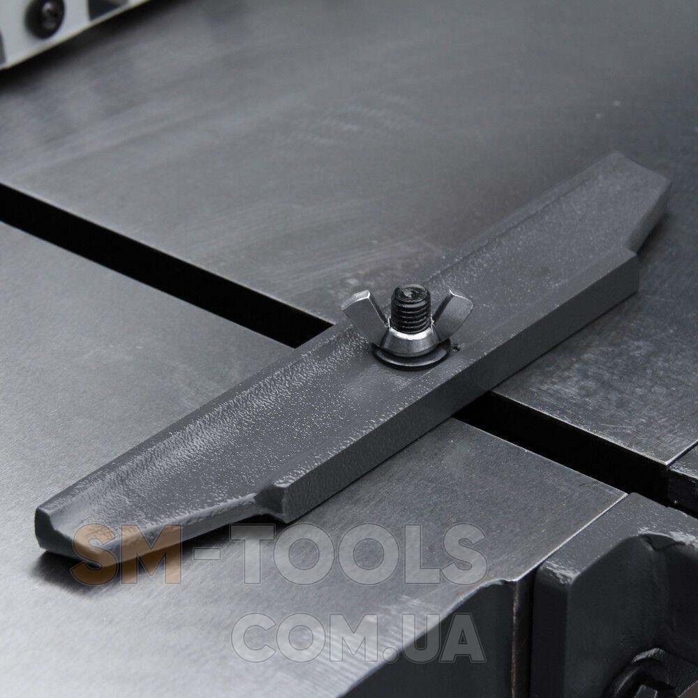 Рабочий стол гильотины с двух сторон снабжен упорами и линейками, облегчающими размещение заготовки. На каждом упоре нанесена миллиметровая шкала, облегчающая позиционирование листа металла. Стол также имеет Т-образный паз, по которому перемещается упор для резки под углом. Для поддержания длинных листов гильотина укомплектована передним выдвижным упором до 880 мм.
