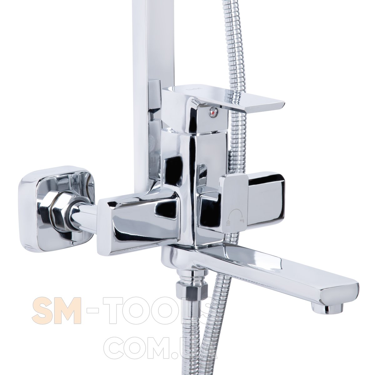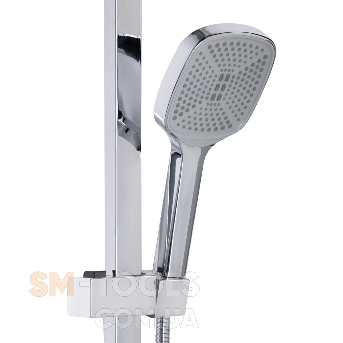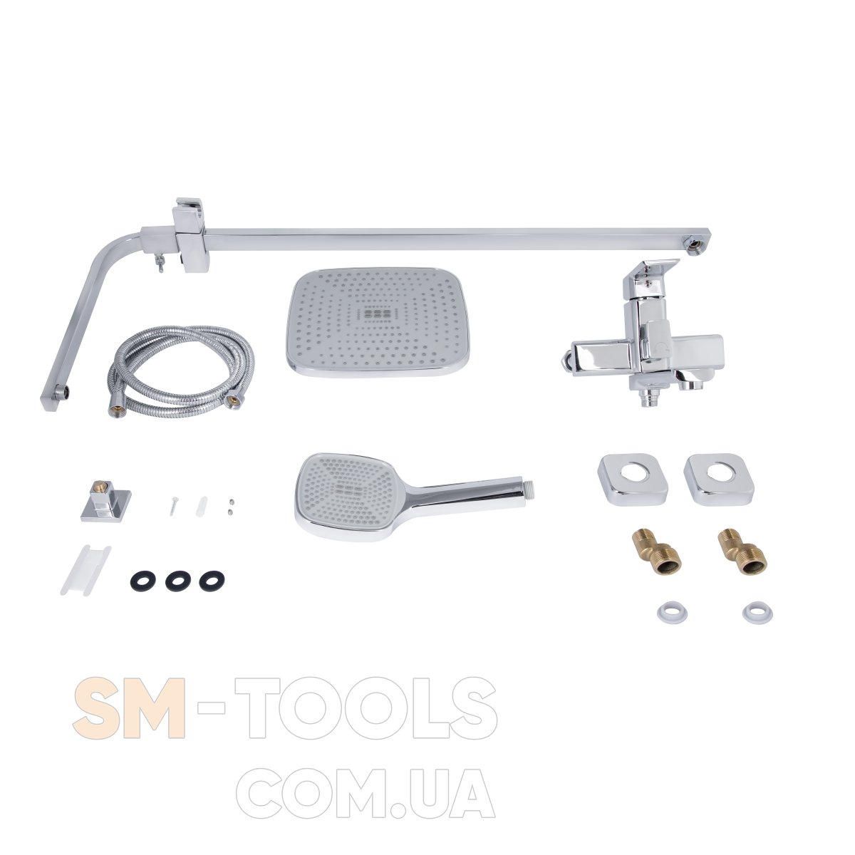 Комплектация : Смеситель, кронштейн для верхнего душа, воронка для верхнего душа, кронштейн для ручного душа, воронка для ручного душа, душевой шланг , душевая стойка, крепеж.