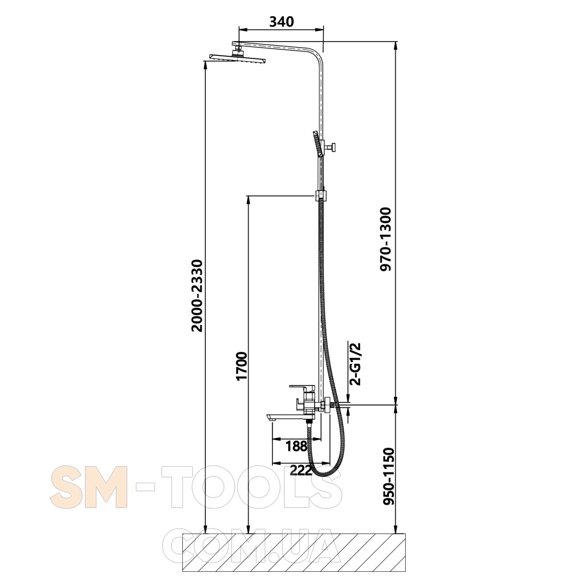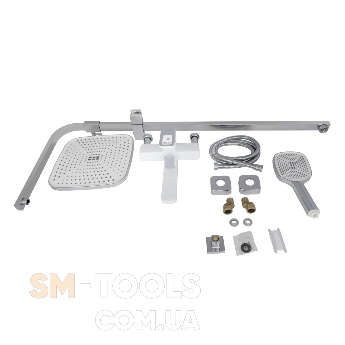 Комплектация : Смеситель, кронштейн для верхнего душа, воронка для верхнего душа, кронштейн для ручного душа, воронка для ручного душа, душевой шланг, душевая стойка, крепеж.