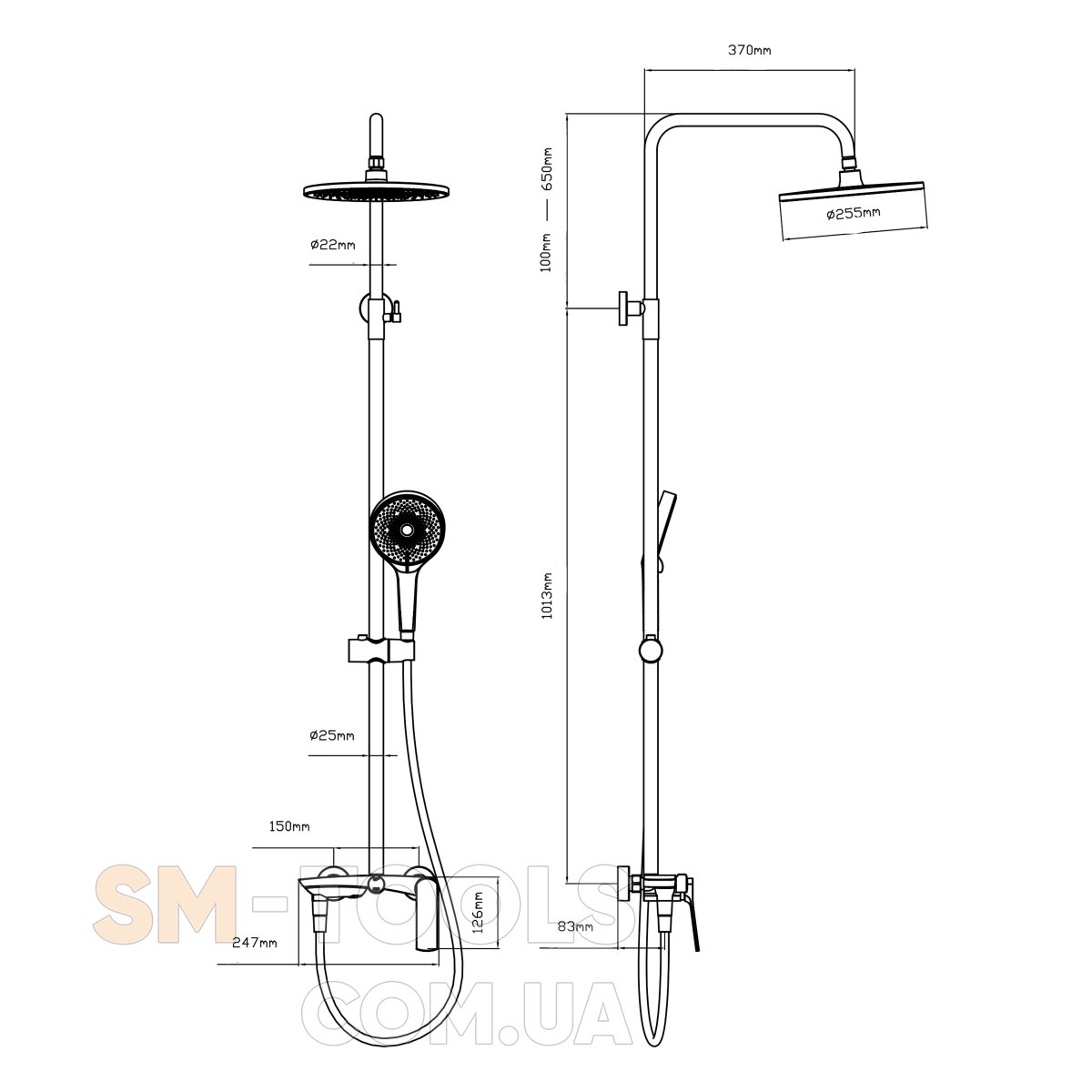Комплектация: Смеситель, кронштейн для верхнего душа, воронка для верхнего душа, кронштейн для ручного душа, воронка для ручного душа, душевой шланг, душевая стойка, детали крепления.