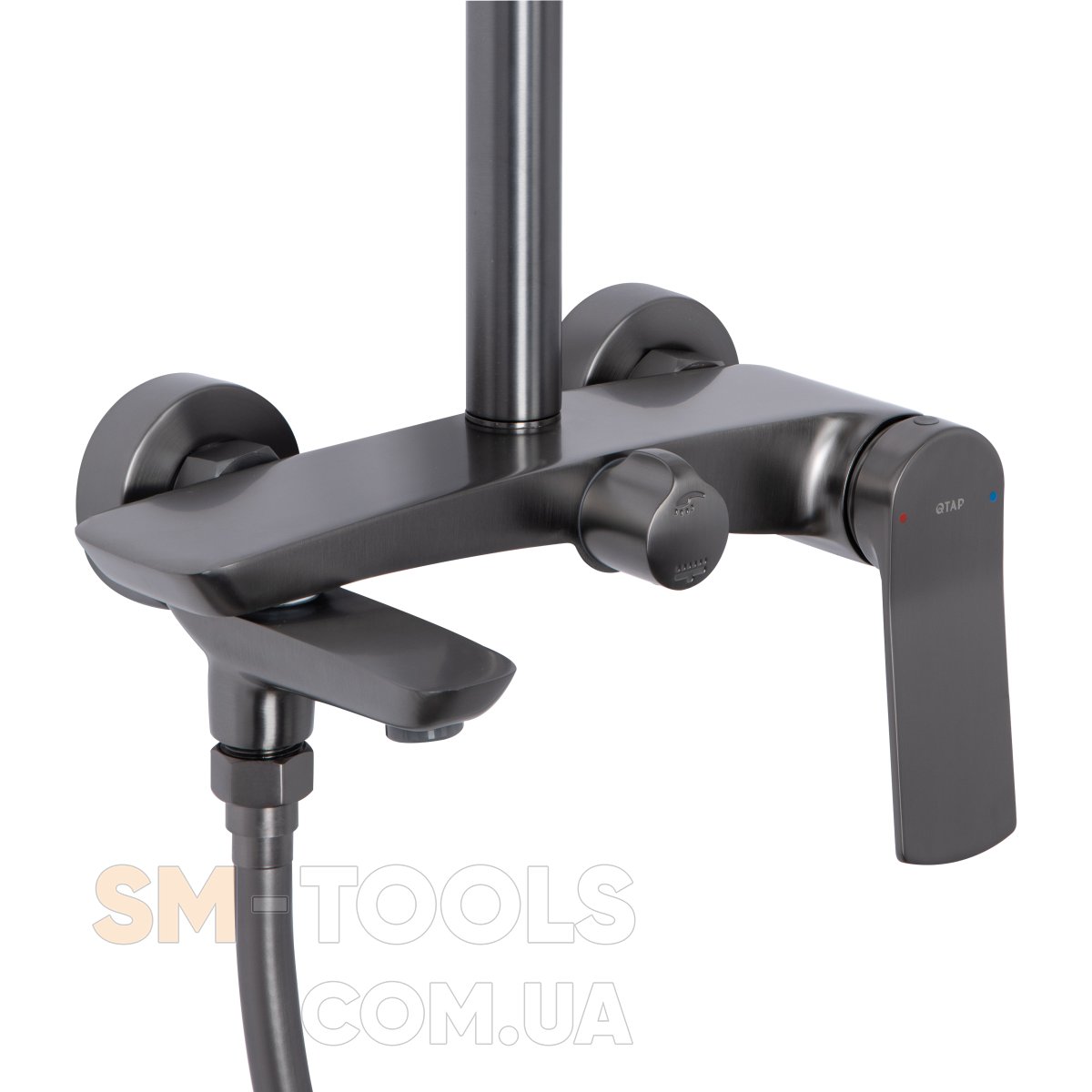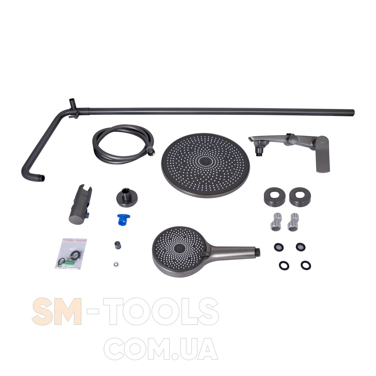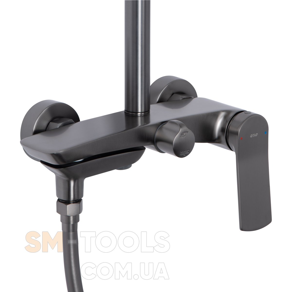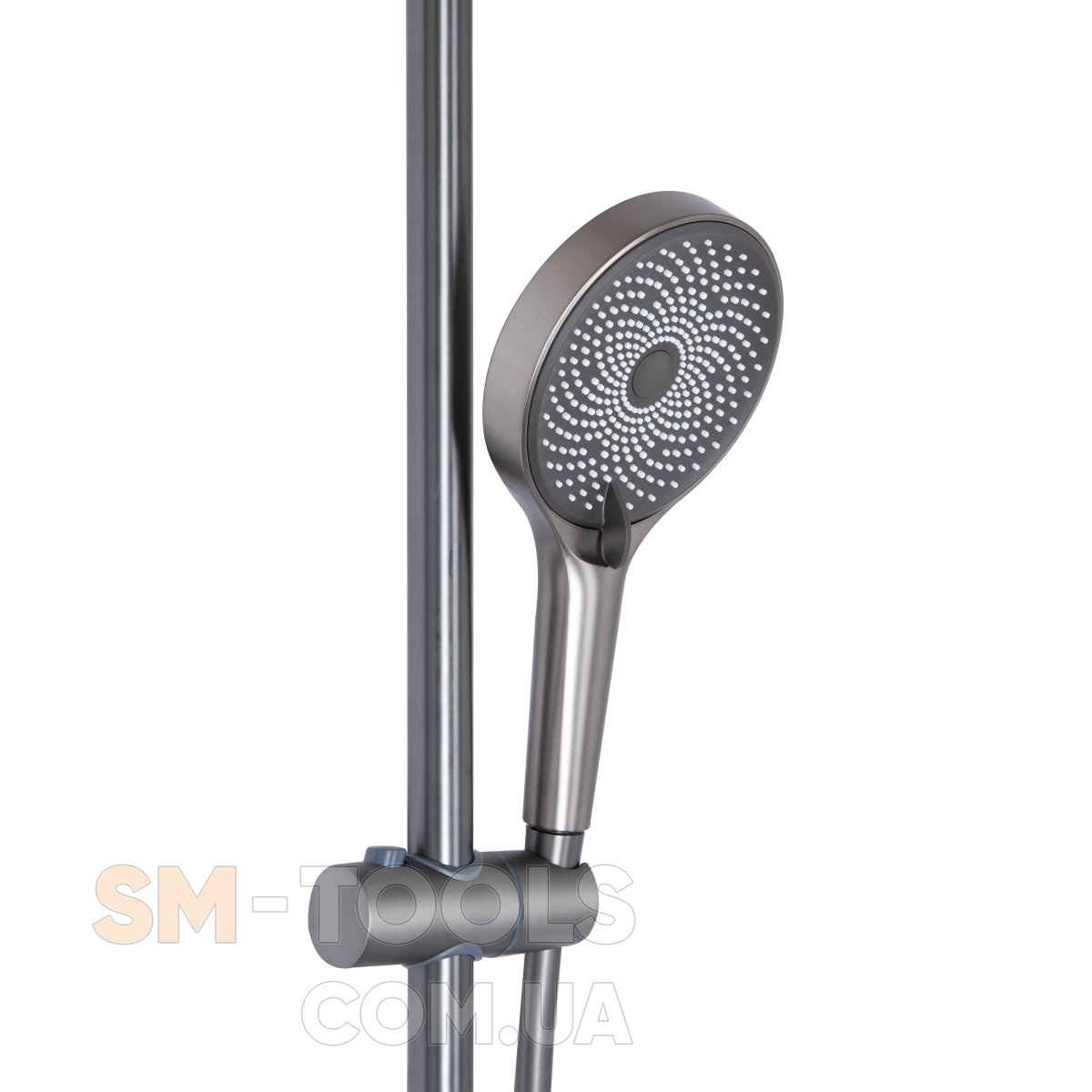 Душевая система Qtap Slavonice QTSLA111GMB45910 в исполнении Gunmetal Black PVD функциональность Система включает верхний душ, ручной душ и излив для ванной, обеспечивая разнообразие режимов использования. Покрытие Gunmetal Black PVD отличается прочностью и стойкостью к коррозии.