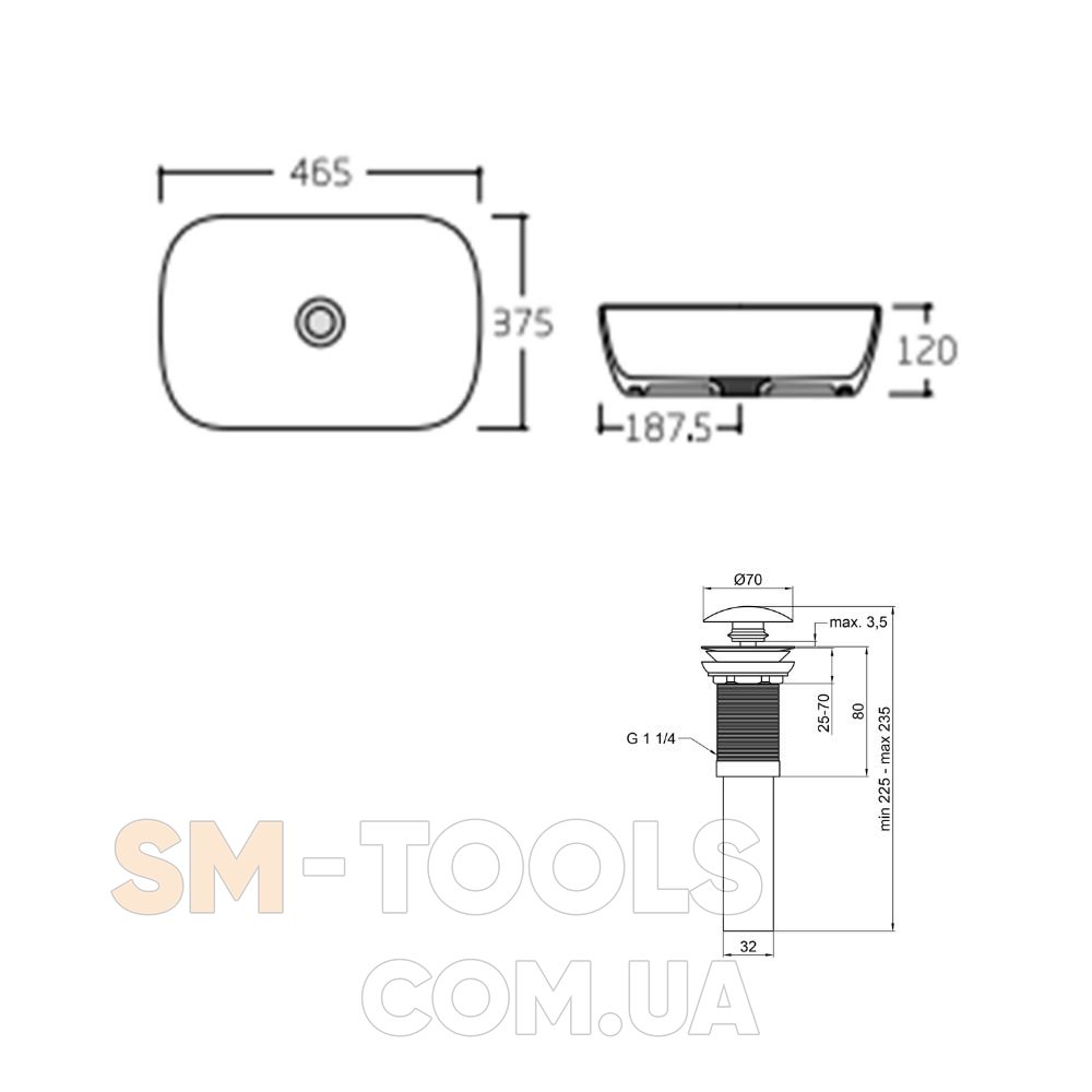 Габаритные размеры изделия (ШхГхВ), мм: 465х375х120 – раковина; 70х70х225 – донный клапан