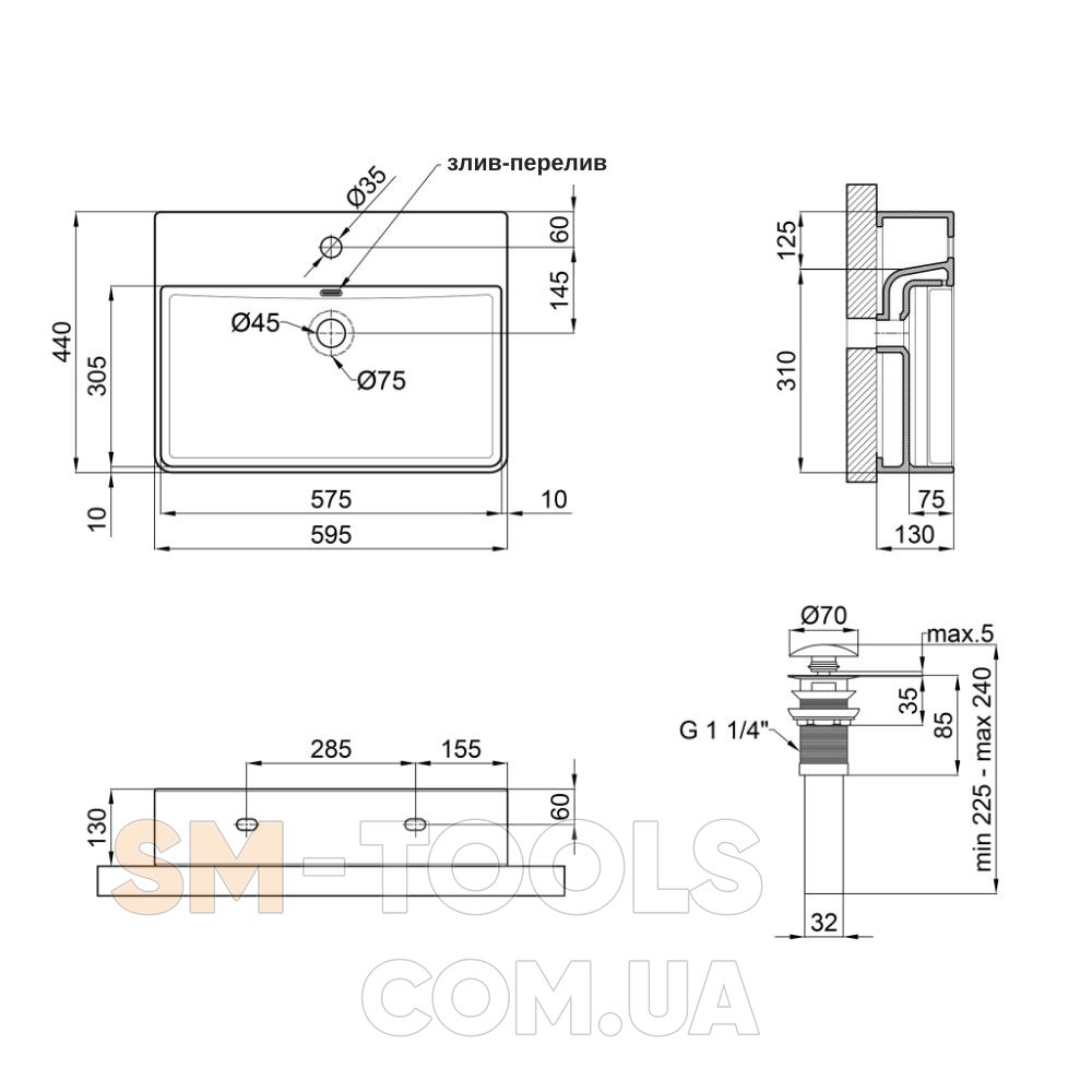 Габаритные размеры изделия (ШхГхВ), мм: 595х440х130 – раковина; 70х70х225 - донный клапан