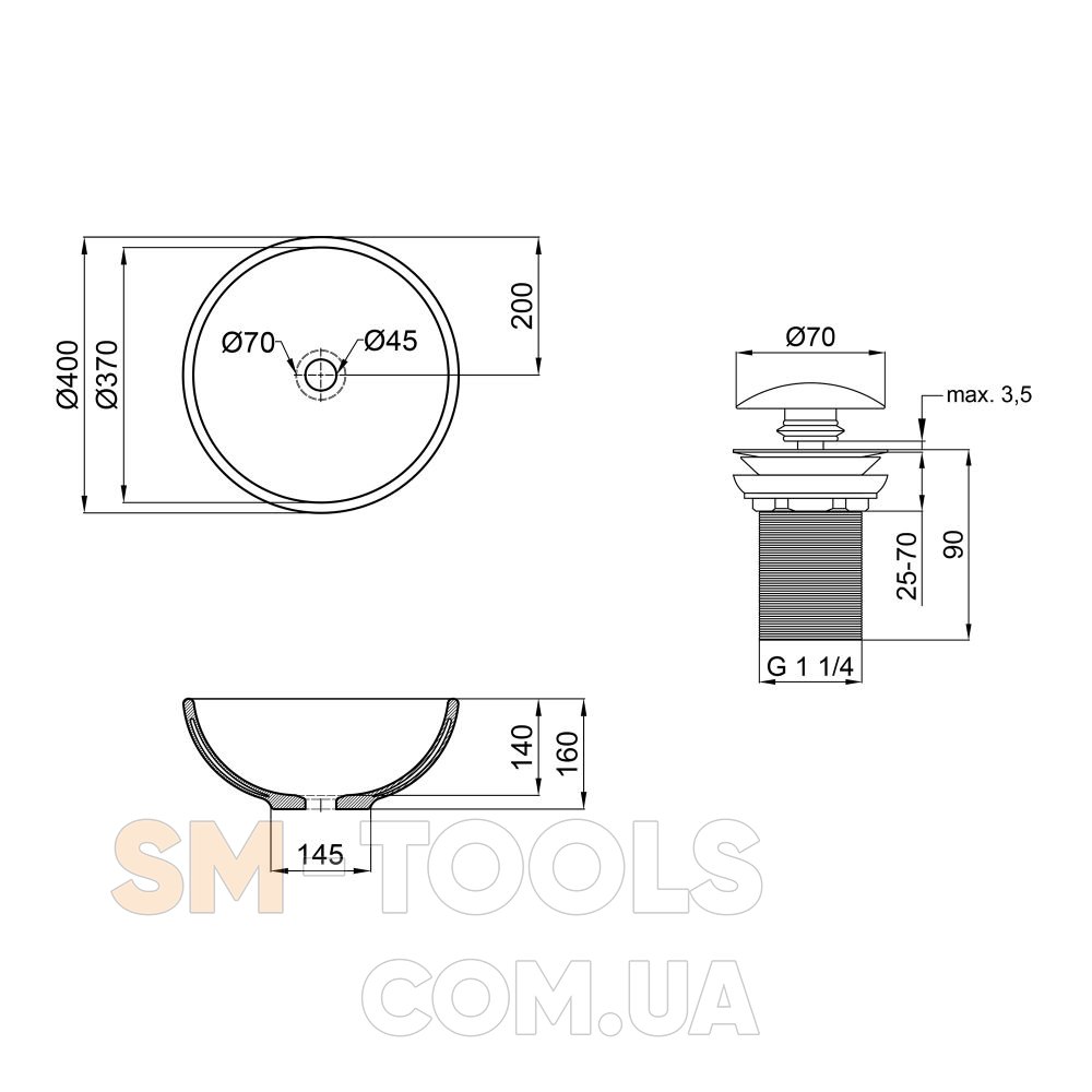 Габаритные размеры изделия (ШхГхВ), мм: 400х400х160 – раковина; 70х70х225 - донный клапан