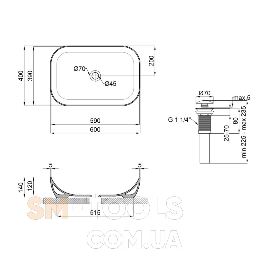 Габаритные размеры изделия (ШхГхВ), мм: 600х400х140 – раковина; 70х70х225 - донный клапан