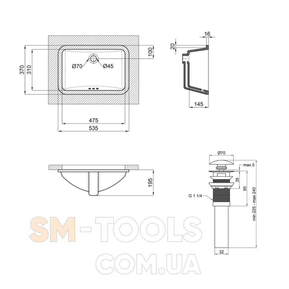 Габаритные размеры изделия (ШхГхВ), мм: 535х370х195 – раковина; 70х70х225 - донный клапан