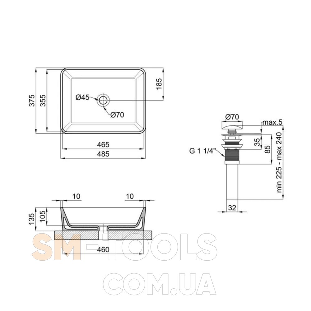 Габаритные размеры изделия (ШхГхВ), мм: 485х375х135 – раковина; 70х70х225 - донный клапан