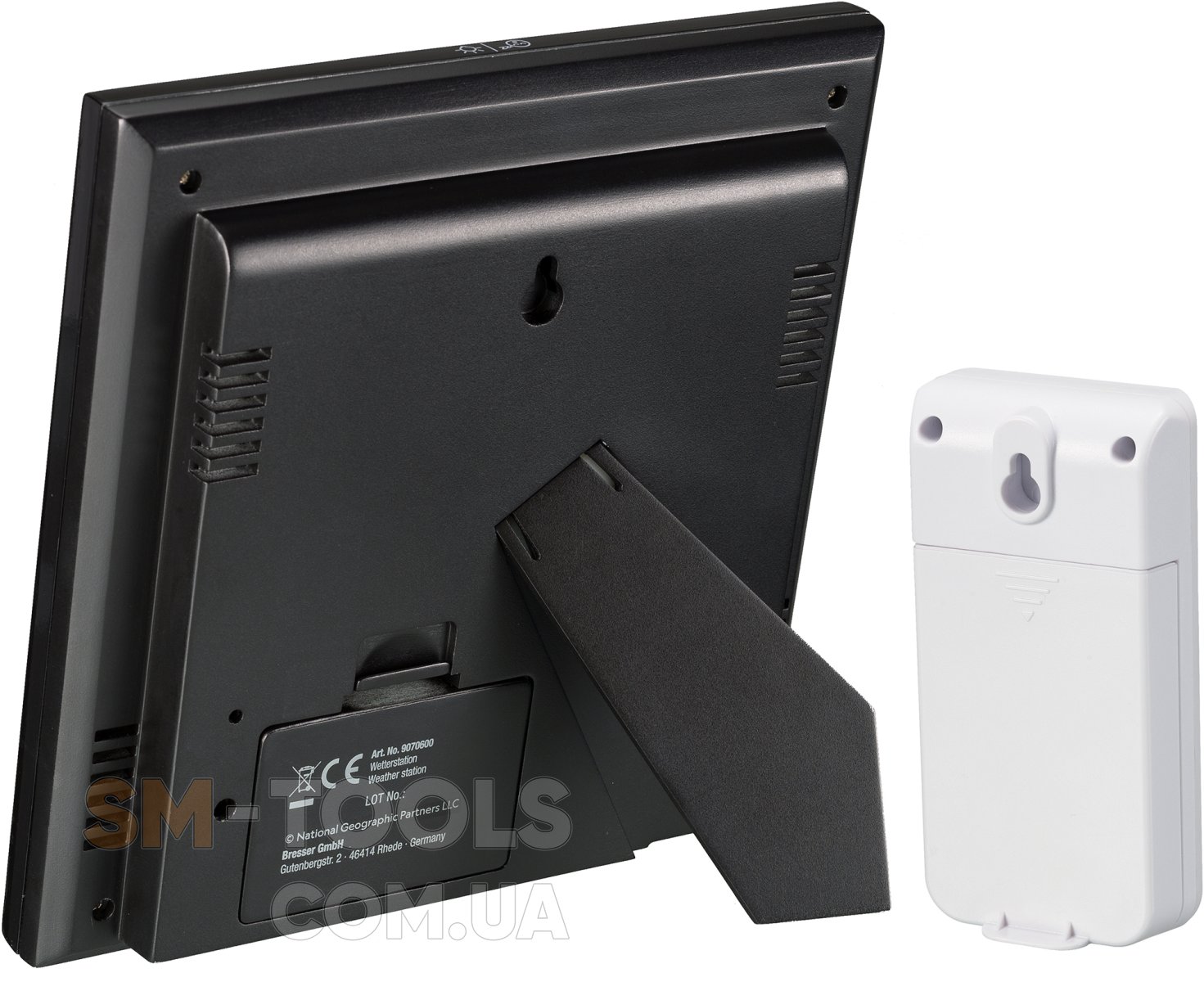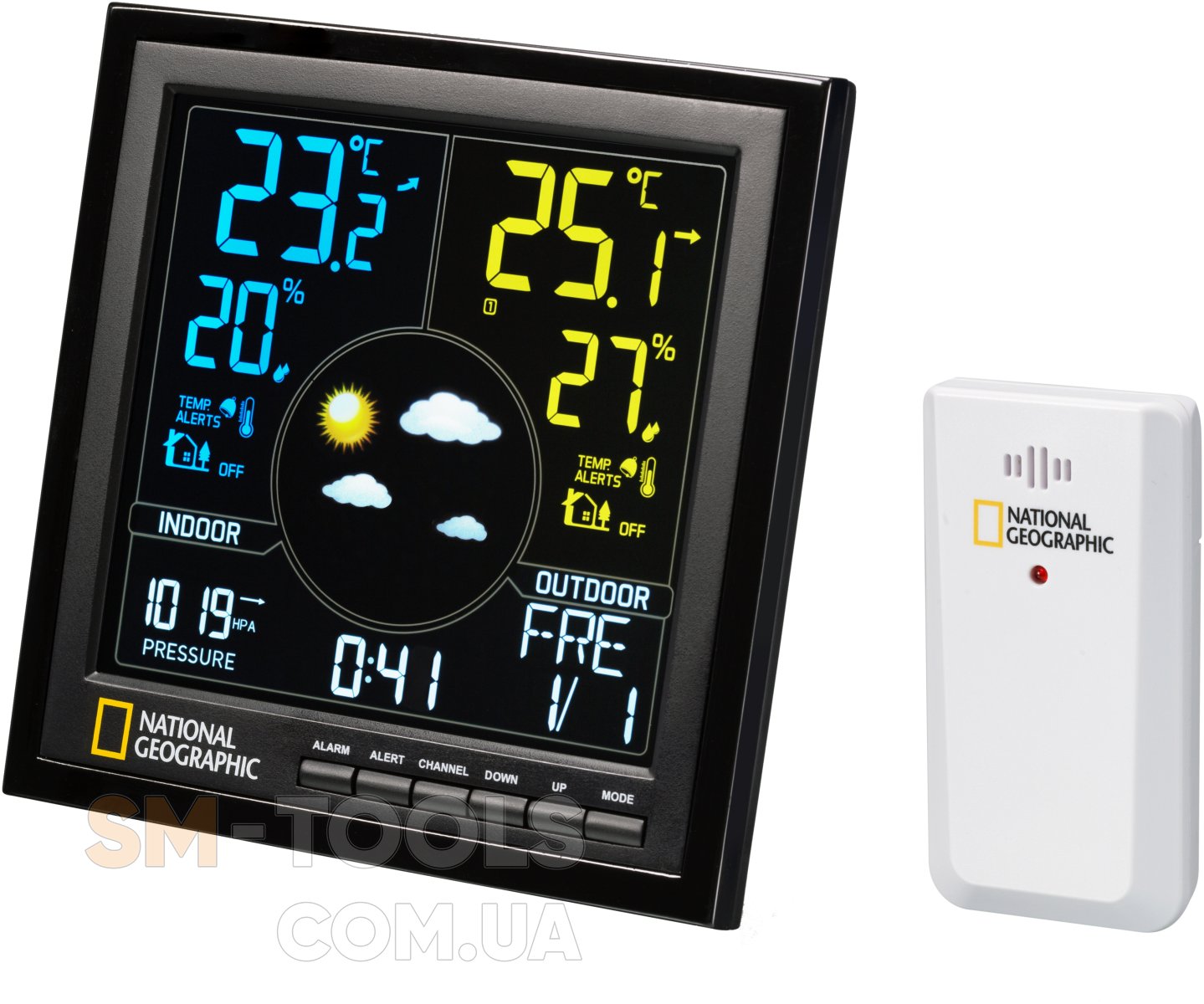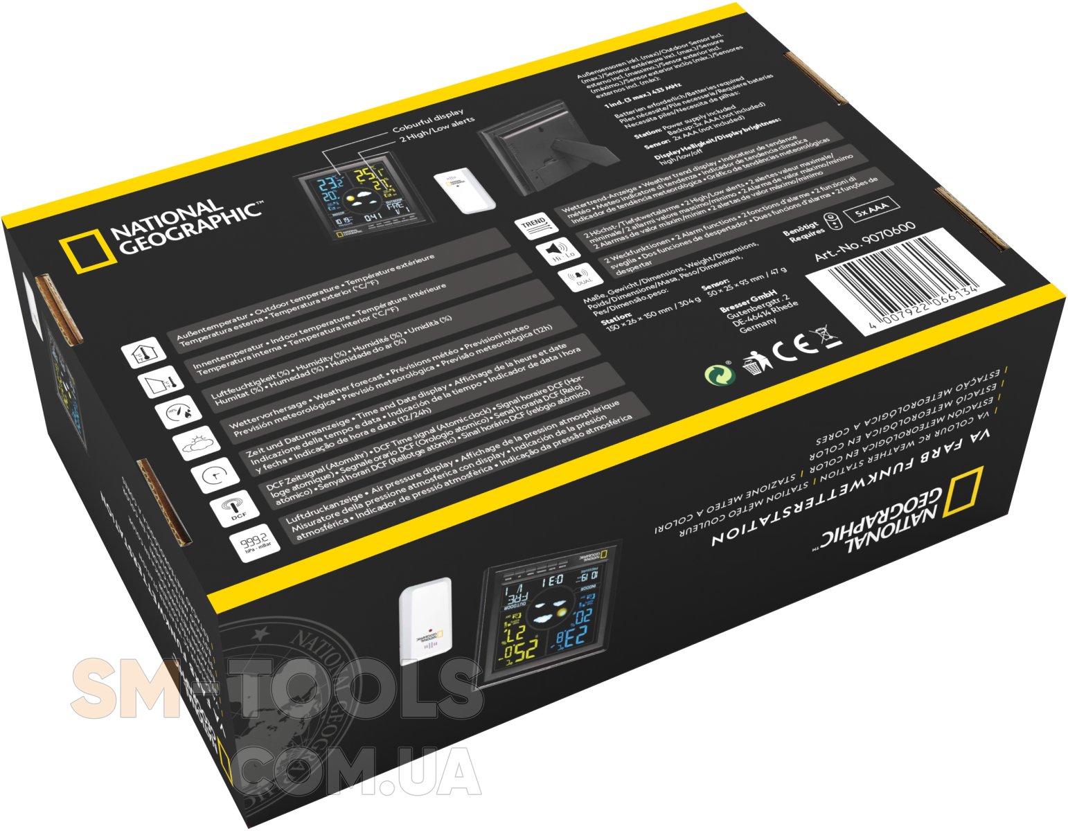 Метеостанция National Geographic VA Colour (Black) (9070600) благодаря цветному дисплею LCD-дисплея показывает и внешне важную информацию о погоде. На дисплее выводится не только информация об внутренней и наружной температуре и влажности, но и точное время DCF, получаемое с помощью радиочастотного передатчика. Также отображается текущий Метеостанция также имеет функцию прогноза погоды на следующие 24 часа, измерение атмосферного давления, сигнал будильника, подсветку, которая дополняет эту многофункциональную станцию.