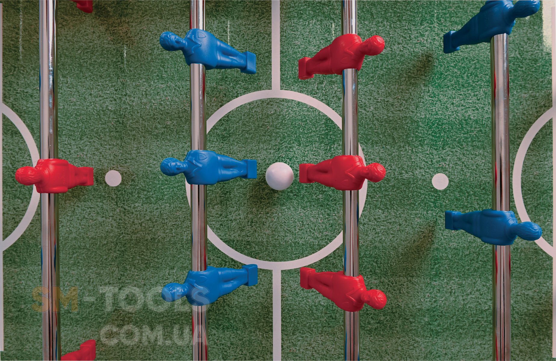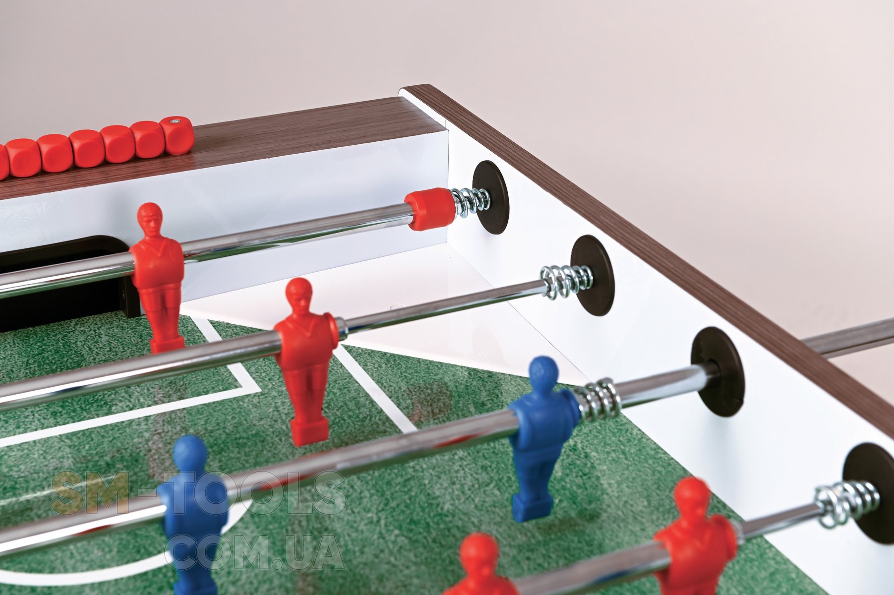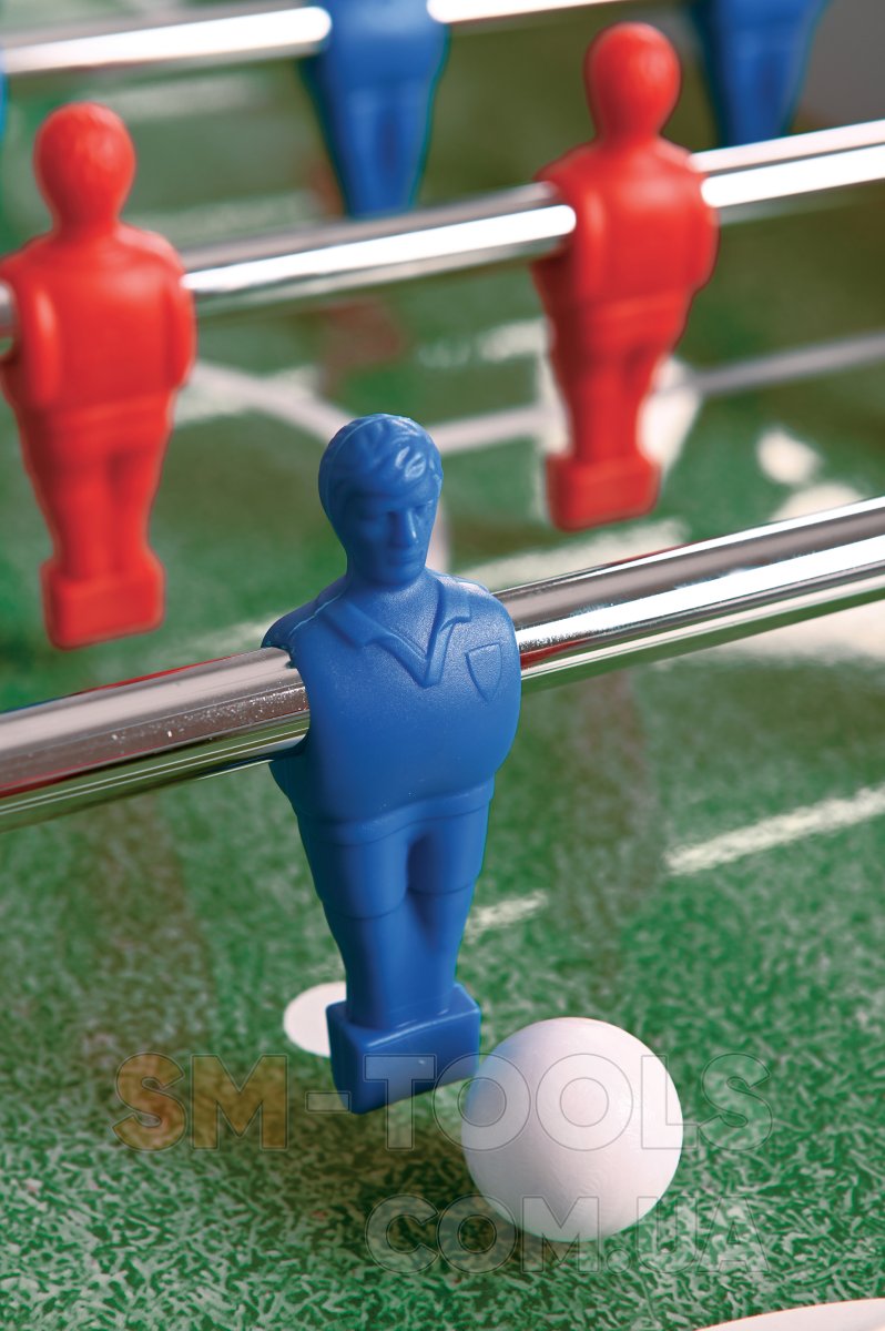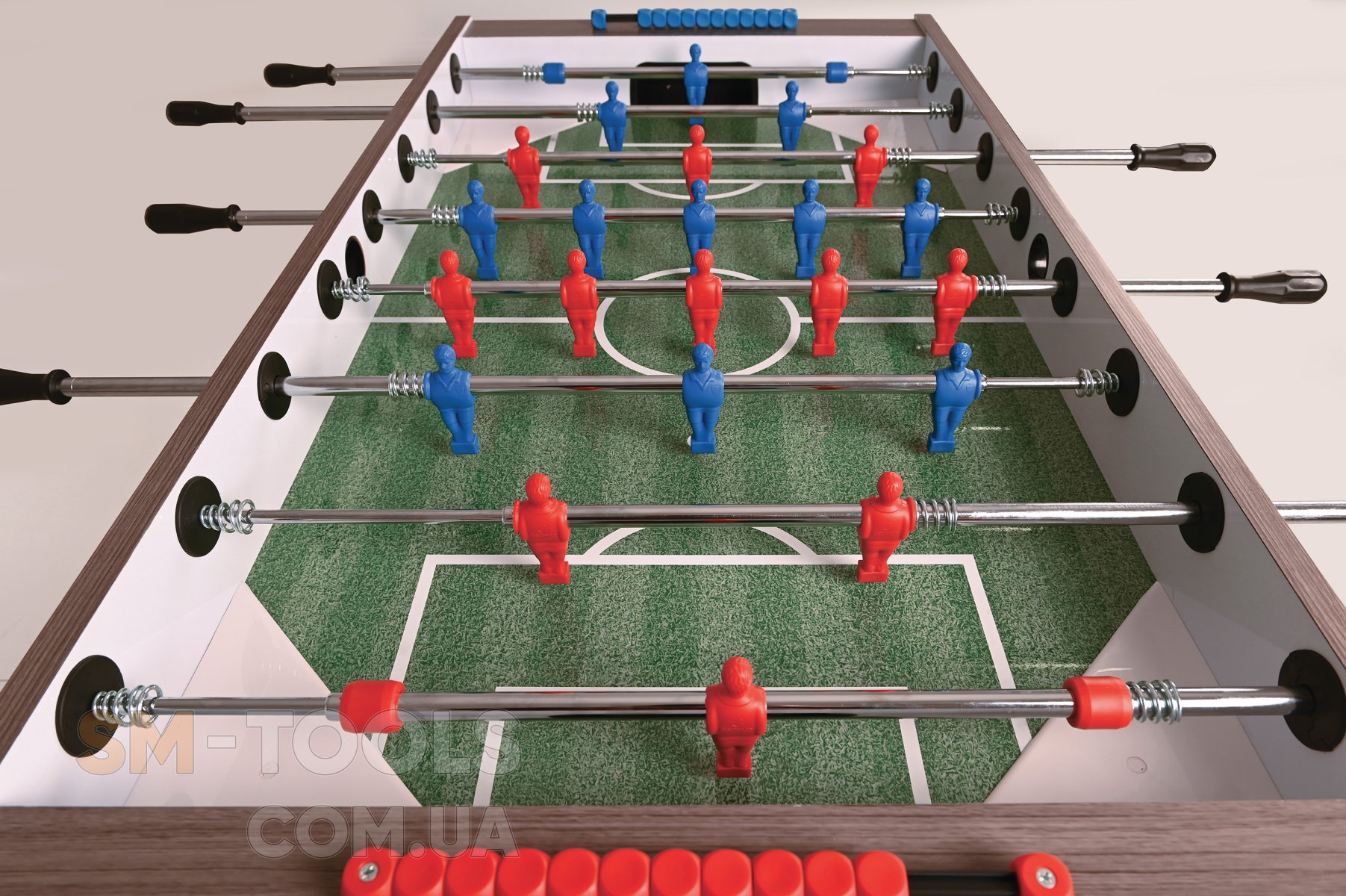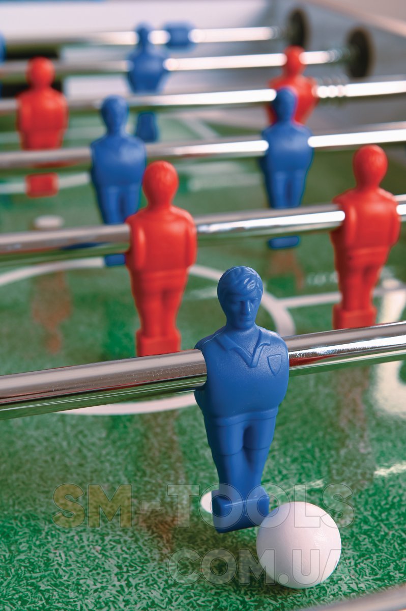- Игровое поле из МДФ с меламиновым покрытием. Особый эффект травы создает впечатление игры на футбольном поле. Поднятые углы позволяют быстро вернуть мяч в игру. Хромированные стальные телескопические штанги & Oslash; 15 мм. Качество используемых материалов увеличивает толщину на 2 мм для предотвращения изгиба штанг и сохранения идеальной формы в течение длительного времени. 2 защитника – 5 полузащитников – 3 нападающие.