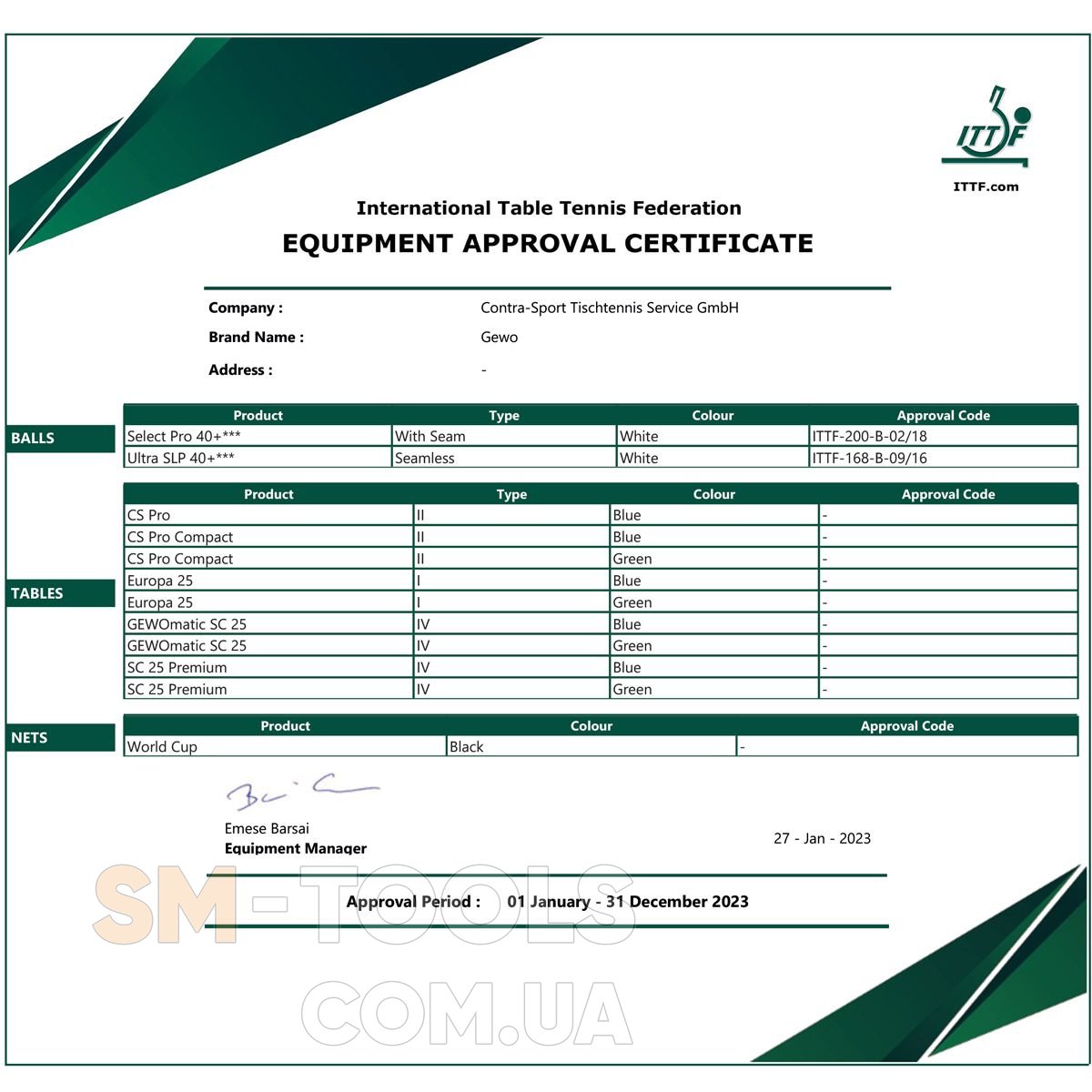 - продукция изготовлена в Германии, что является синонимом высоких стандартов и технологий. Этот знак является одним из самых уважаемых в мире обозначений происхождения товаров. В комплект поставки не входит сетка для настольного тенниса, позволяющая индивидуально подобрать их. аксессуары высочайшего уровня. Мы рекомендуем сетку Gewo Net World Cup ITTF (19910000)сертифицированную Международной федерацией настольного тенниса (ITTF) для игры на официальных соревнованиях. >Условия использования и хранения: Стол для настольного тенниса рекомендуется размещать только в сухих помещениях только в сухих помещениях. с влажностью до 60%, с хорошей циркуляцией воздуха. Следует избегать влияния солнечных лучей и не эксплуатировать на улице под солнцем и дождем.