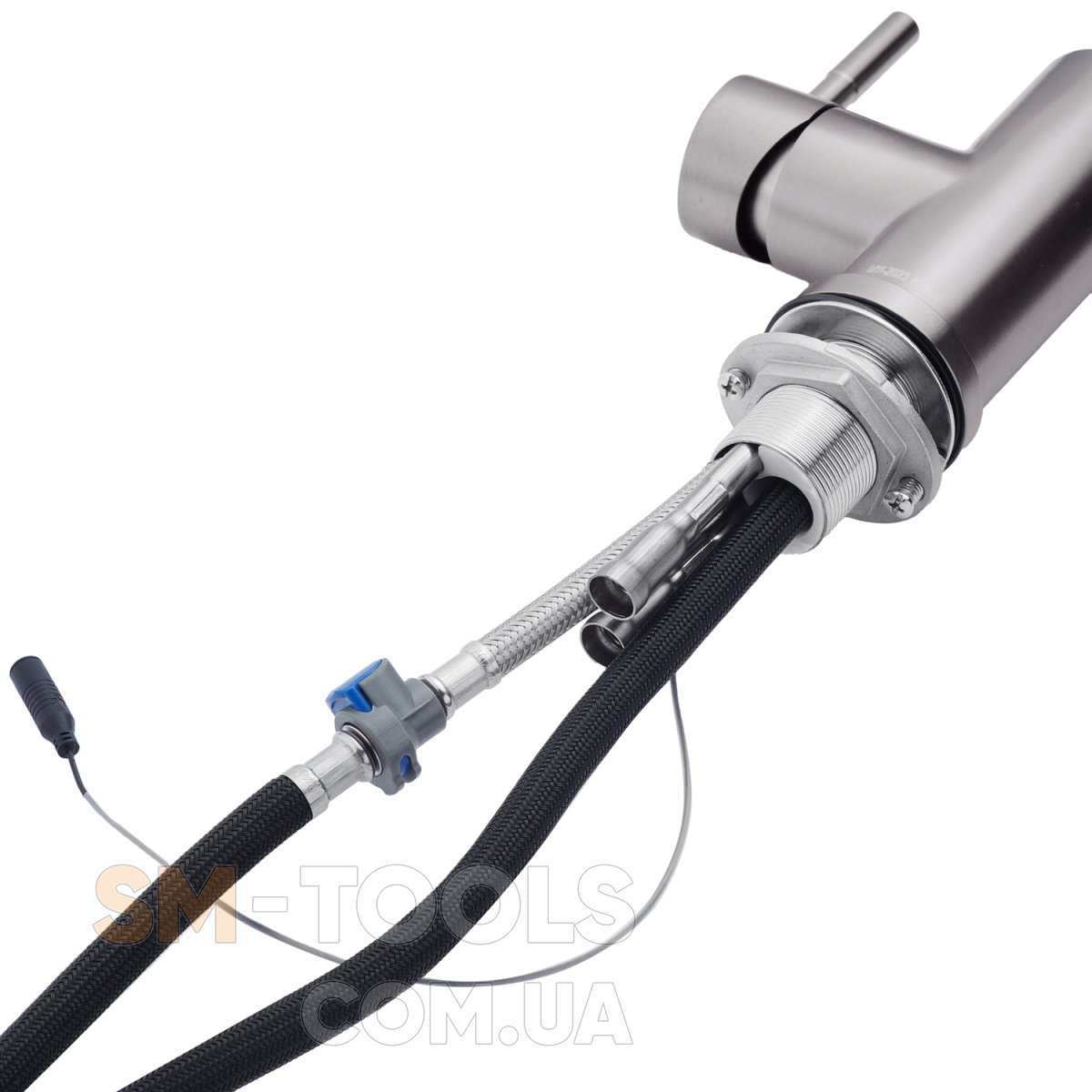 Комплектация : Смеситель, гибкая подводка , шланг для выдвижной воронки, воронка, якорь, электромагнитный клапан, блок питание, крепление.