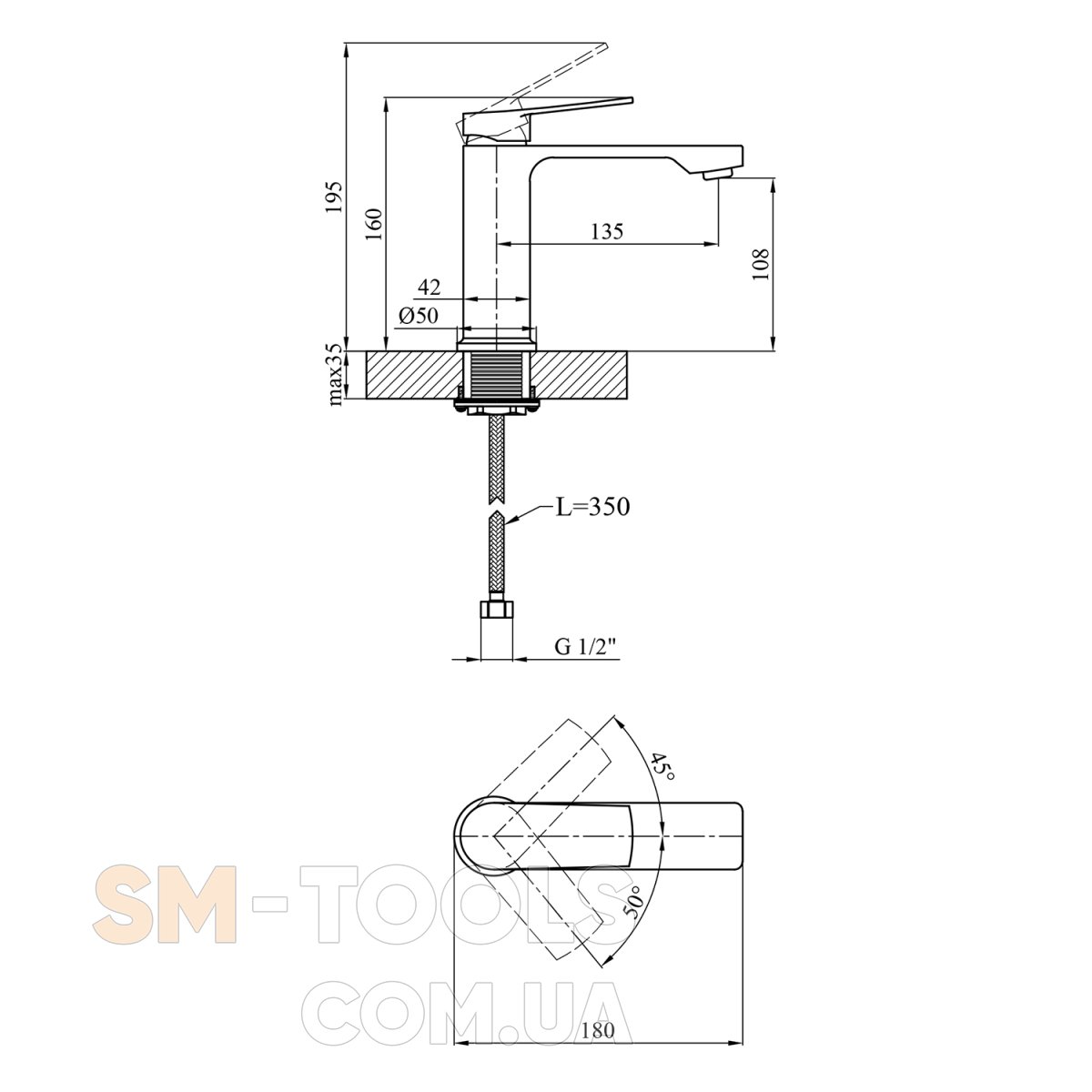 Монтаж выполняется врезным способом с использованием гайки, что гарантирует надежную фиксацию. Подключение воды осуществляется с помощью гибких подводов, которые входят в комплект, что значительно облегчает установку. Размеры смесителя оптимальны для удобного использования: высота составляет 160 мм, ширина — 50 мм, глубина — 180 мм. Литое излияние обеспечивает надежность и устойчивость конструкции. Его высота — 108 мм, а длина — 135 мм, что позволяет комфортно пользоваться смесителем в повседневной жизни. Механизм смешивания базируется на керамическом картридже диаметром 30 мм, который обеспечивает плавную и точную регулировку температуры и напора воды.