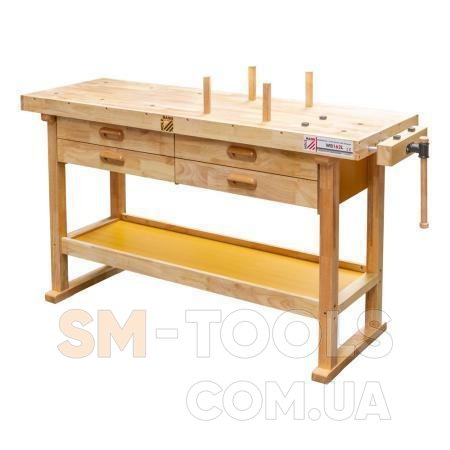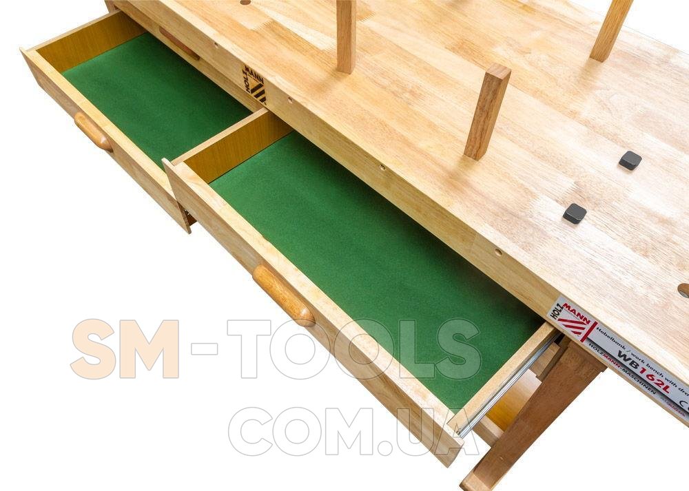 Особливістю верстака є вбудовані лещата, що забезпечує зручність і функціональність робочого місця без втрати простору. Для зберігання інструментів і аксесуарів є 4 місткі шухляди, максимальне навантаження на кожну може бути до 30 кг. Полиця у нижній частині верстака дозволяє зручно зберігати заготовки та великі інструменти. Для встановлення струбцин і клинів є спеціальні отвори. Купити столярний верстак Holzmann WB 162L за вигідною ціною ви можете на сайті офіційного постачальника виробника KMA.UA.