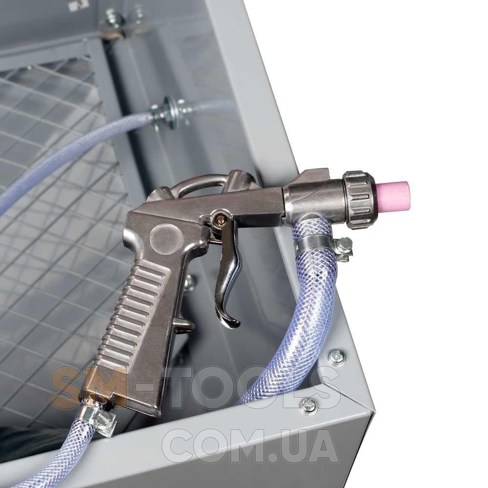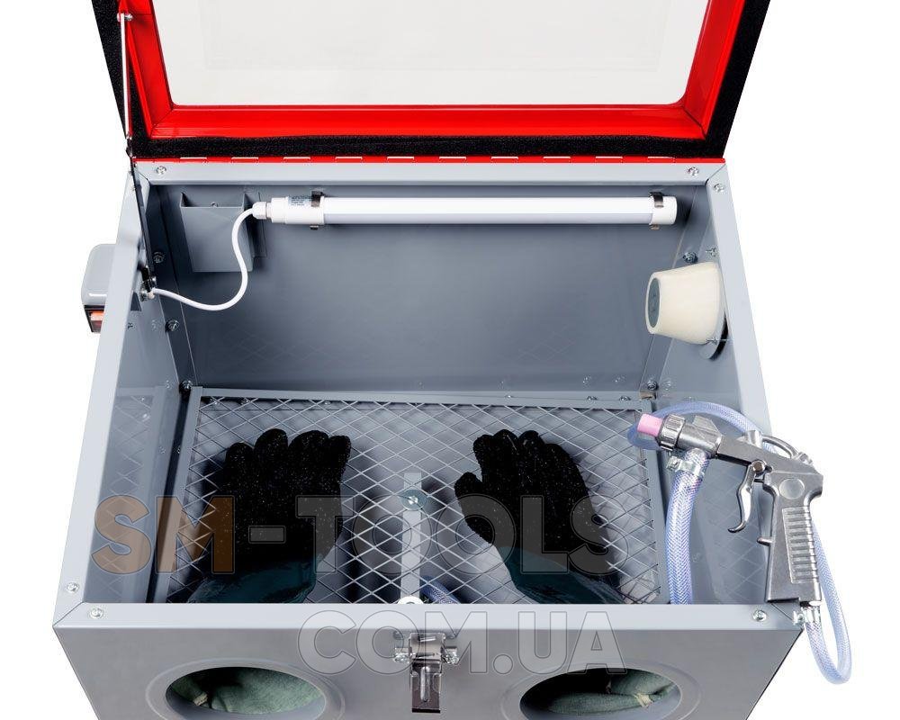 У комплектацію камери входить піскоструминний пістолет з 4 змінними керамічними насадками, що дає змогу коригувати напрямок та інтенсивність абразивного потоку, і пара високоякісних гумових рукавичок з фіксованим кріпленням для стаціонарного встановлення. Підсвічування робочої зони і розташоване зверху велике оглядове вікно дозволяють ретельно контролювати процес обробки. Якщо вас зацікавила ця мобільна піскоструминна камера купити її на нашому сайті можна з гарантією 24 місяці.