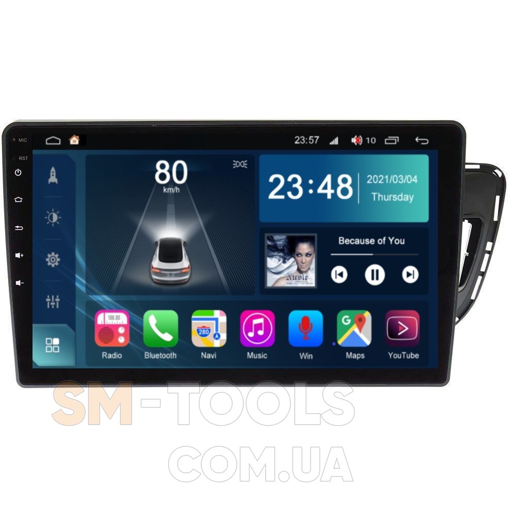 Цифрова магнітола, дизайн якої повністю розроблений під особливості салону вашого автомобіля, працює на ОС Andriod, підтримує інтернет-підключення Wi-Fi, 3G/4G, систему контролю тиску в шинах TPMS, систему кругового огляду 360 градусів, а також Carplay/Android Auto і відповідає самим високі вимоги любителів музики під час поїздок на авто.