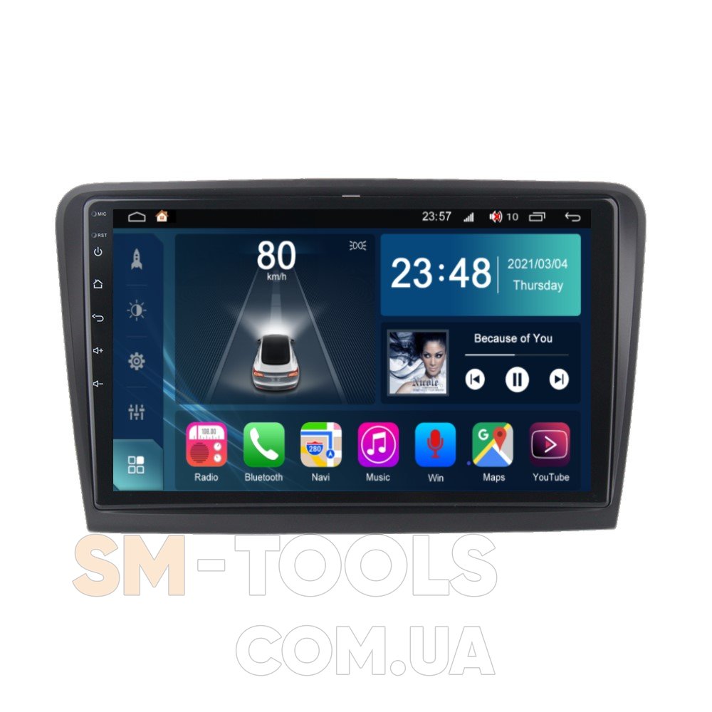 Цифрова магнітола, дизайн якої повністю розроблений під особливості салону вашого автомобіля, працює на ОС Andriod, підтримує інтернет-підключення Wi-Fi, 3G/4G, систему контролю тиску в шинах TPMS, систему кругового огляду 360 градусів, а також Carplay/Android Auto і відповідає самим високі вимоги любителів музики під час поїздок на авто.