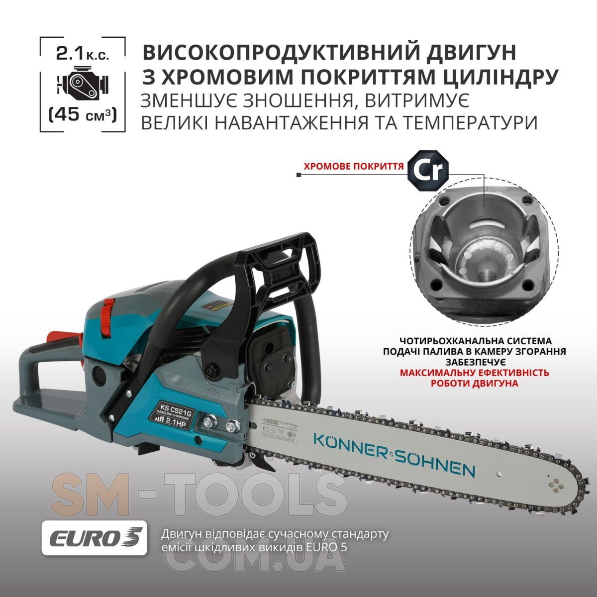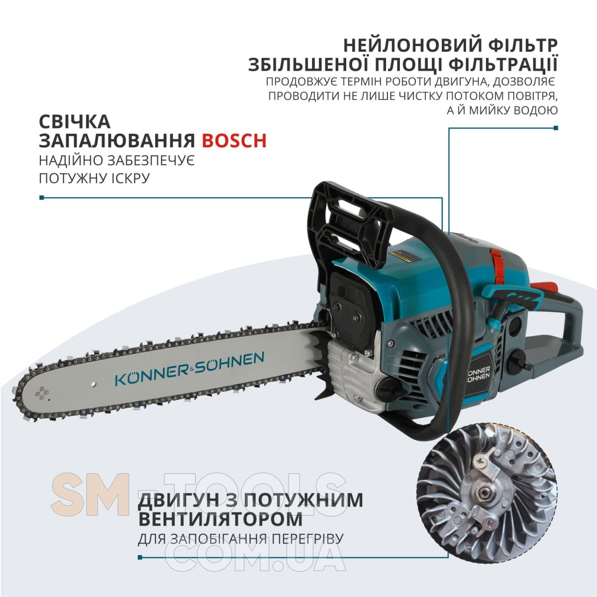 - ВЫСОКАЯ ЭФФЕКТИВНОСТЬ ДВИГАТЕЛЕЙ: Двигатели бензопил K?nner & S?hnen отличаются высокой надежностью и стойкостью к износу, что гарантирует длительный срок службы инструмента.