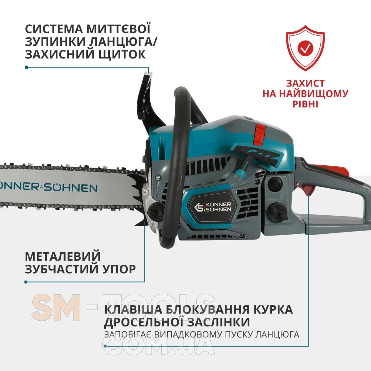 Бензиновые цепные пилы K?nner & S?hnen® оснащены встроенными защитными функциями.