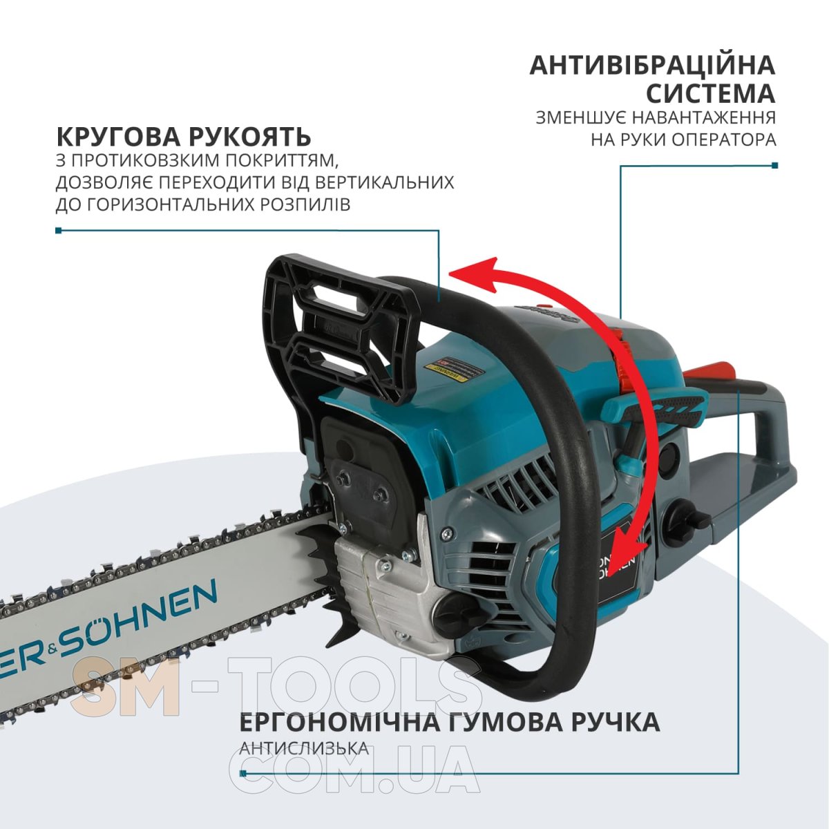 - КРУГОВАЯ РУКОЯТКА: Ручка-дуга на бензопили – это важная деталь, которая существенно влияет на удобство, позволяя легко выбирать любой угол резки и переходить от вертикальных к горизонтальным распилам с несравнимой точностью.