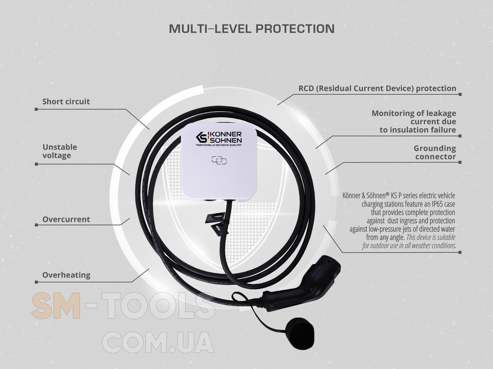 Станции для зарядки электромобилей серии KS P от K?nner & S?hnen® изготовлены в корпусе с классом защиты IP65, обеспечивающим полную защиту от проникновения пыли внутрь, и защиту от струй воды падающих под любым углом даже под давлением. Данное устройство может работать на улице в любых условиях.