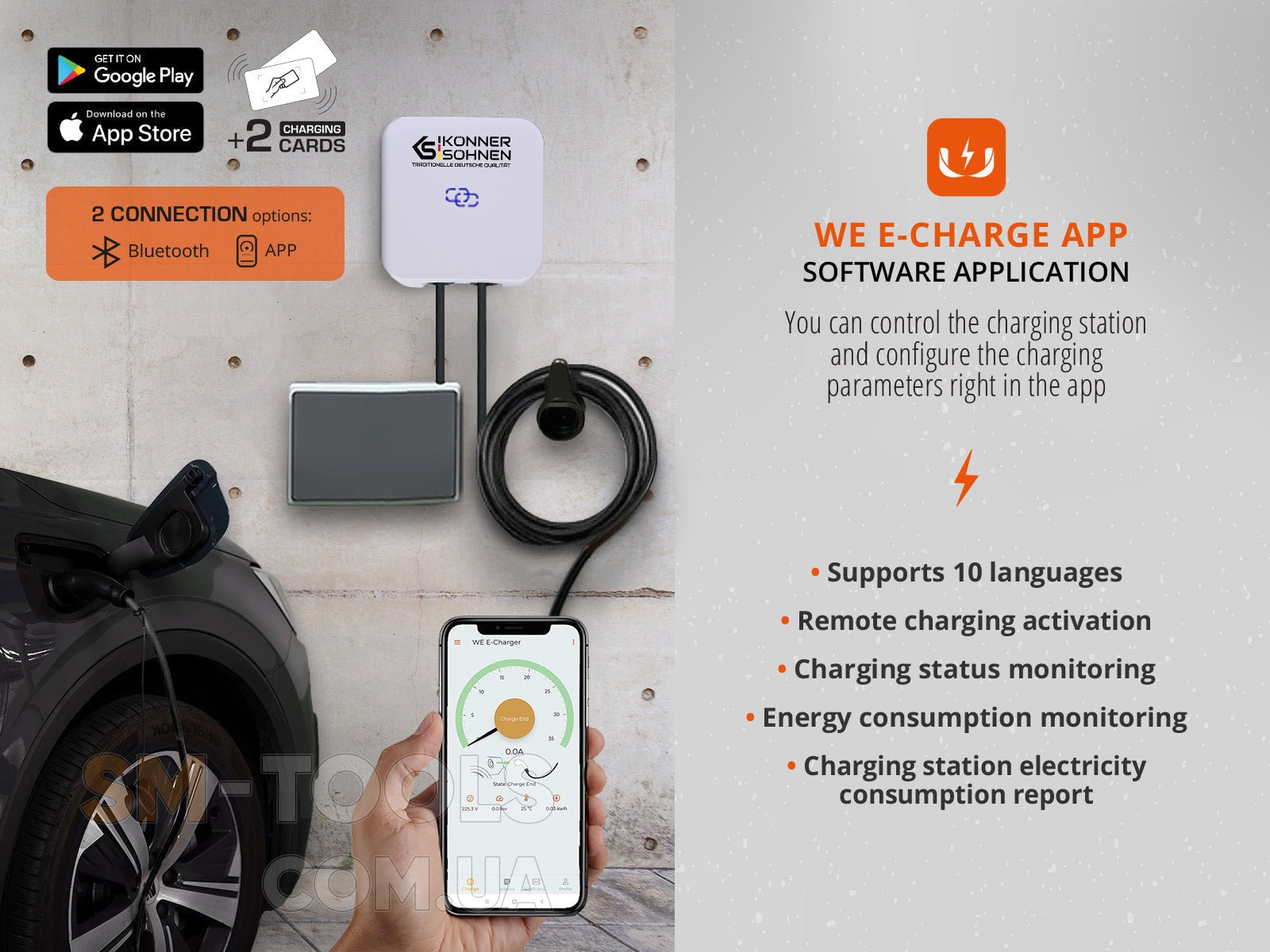 Оснащен зарядным штекером Type 2 (в соответствии с DIN IEC 62196-2), который подходит для большинства моделей электромобилей. Благодаря зарядному кабелю длиной 5 м вы сможете использовать разные варианты для парковки.