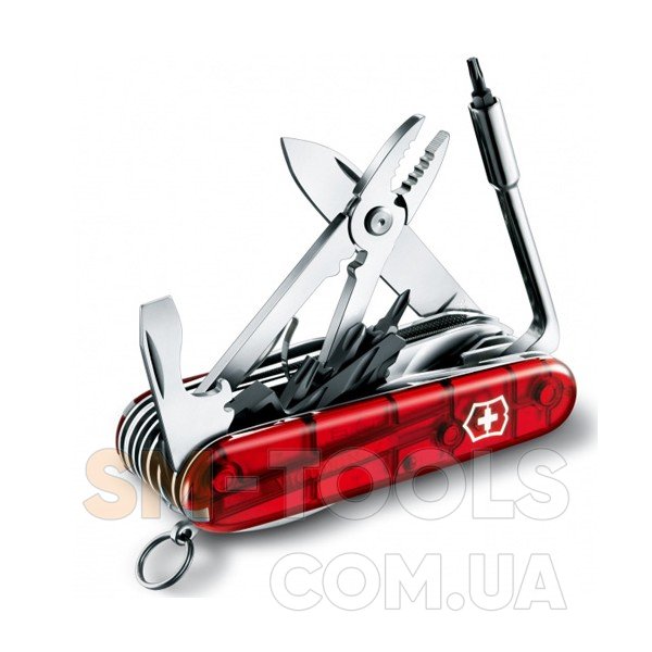 Складной нож Victorinox Cybertool Vx17925.T – великолепный помощник в работе с компьютерами. В отличии от других моделей шестислойный, многофункциональный швейцарский нож содержит: специальный пластиковый держатель насадок, приспособление для переключения DIP-переключателей, а так же ключ с гнездом для шестигранников. Безусловно, что во многих целях поможет лупа, а так же великолепно пишущая шариковая ручка. Пассатижи снимут изоляцию и сделают обжим проводов. Большой и малый клинки нарежут фрукты, овощи и продукты. Лезвия долгое время не требуют дополнительной заточки. В арсенале складного набора и многоцелевой крючок, который поднимет тяжести, и оттянет предметы. Шило и отвёртки с элементом для снятия изоляции выручат Вас в ремонтах. Консервный нож, открывалка для бутылок, а так же штопор порадуют Вас при застольях. Изготовлен складной набор из высококачественных материалов. В отдельности из нержавеющей стали с накладками из высокопрочного пластика. Выполнен с красивой прозрачной, ярко-красной рукояткой.