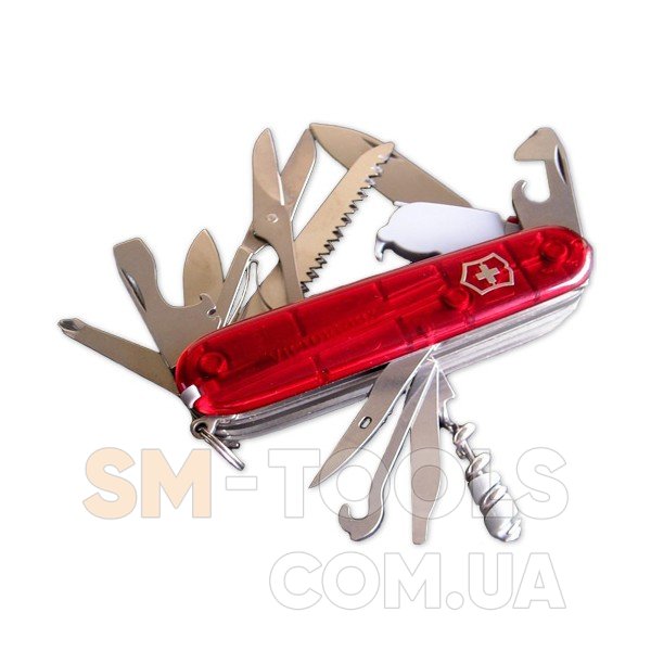 Швейцарский нож Victorinox Huntsman Vx17915.T – замечательный помощник для работы с деревом. Ведь, содержит отлично режущую пилу по дереву. Инструмент срежет ветки и распилит дерево небольшого размера. Особенностью данной модели является светодиодный LED фонарик и великолепно пишущая шариковая ручка. Многофункциональный складной набор оснащён режущими большим и малым клинками. С ними Вы проделаете множество работ. К примеру, на работе вскроете конверт, а в быту почистите и нарежете фрукты, овощи. При застольях Вас порадуют открывалка для бутылок, нож для открытия консервов, а так же штопор, который вытащит любую пробку из бутылки. В ремонтах выручит специальное приспособление для снятия изоляции. А так же крестовая (40 мм) и плоские (3 мм и 6 мм) отвёртки для лёгкого закручивания и откручивания крепёжных изделий. Многоцелевой крючок поднимет и оттянет тяжёлые предметы. В качестве брелка послужит подвесное кольцо. Безусловно, что в повседневностях Вас всегда порадуют ножницы и пинцет с зубочисткой. Складной нож выполнен в презентабельном дизайне с красивой ярко-красной рукояткой.