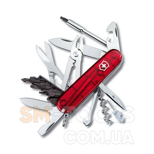 Victorinox Cybertool Vx17725.T – мультифункциональный, высококачественный, швейцарский универсальный нож. Содержит 25 разнообразных инструментов, исполняющих 35 функций. «Swiss Champ. Cyber Tools» оснащён необходимыми стандартными инструментами, которые замечательно подойдут в ежедневном использовании как для мужчин, так и женщин. Безусловно, что в быту каждого порадует открывалка для бутылок, консервный нож, штопор и другие инструменты. Дополнительно складной нож имеет держатель бит, булавку и плоскогубцы. Плюс, складной нож изготовлен исключительно из высококачественных материалов. Главный из них – нержавеющая сталь. Отдельно стоит отметить и красивую полупрозрачную ярко-красную рукоятку, которая не только радует каждый взор, но и в отличии от других моделей позволяет легко выбрать нужный инструмент.
