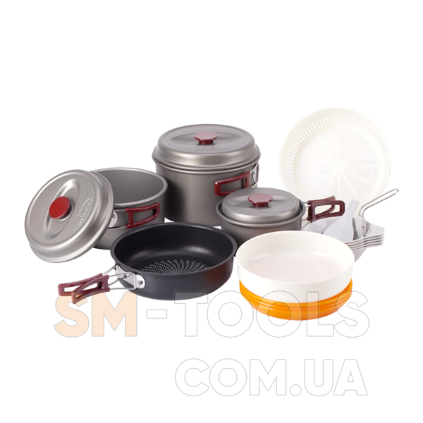 Изготовленный из анодированного алюминия комплект состоит из 2,8-литровой и 1,8-литровой кастрюль, тарелок, тефлоновой сковороды, дуршлага, половника, пластиковых чашек, лопатки.