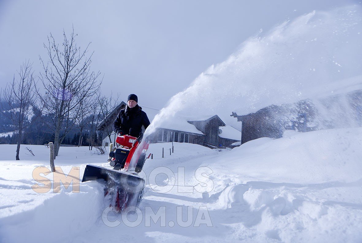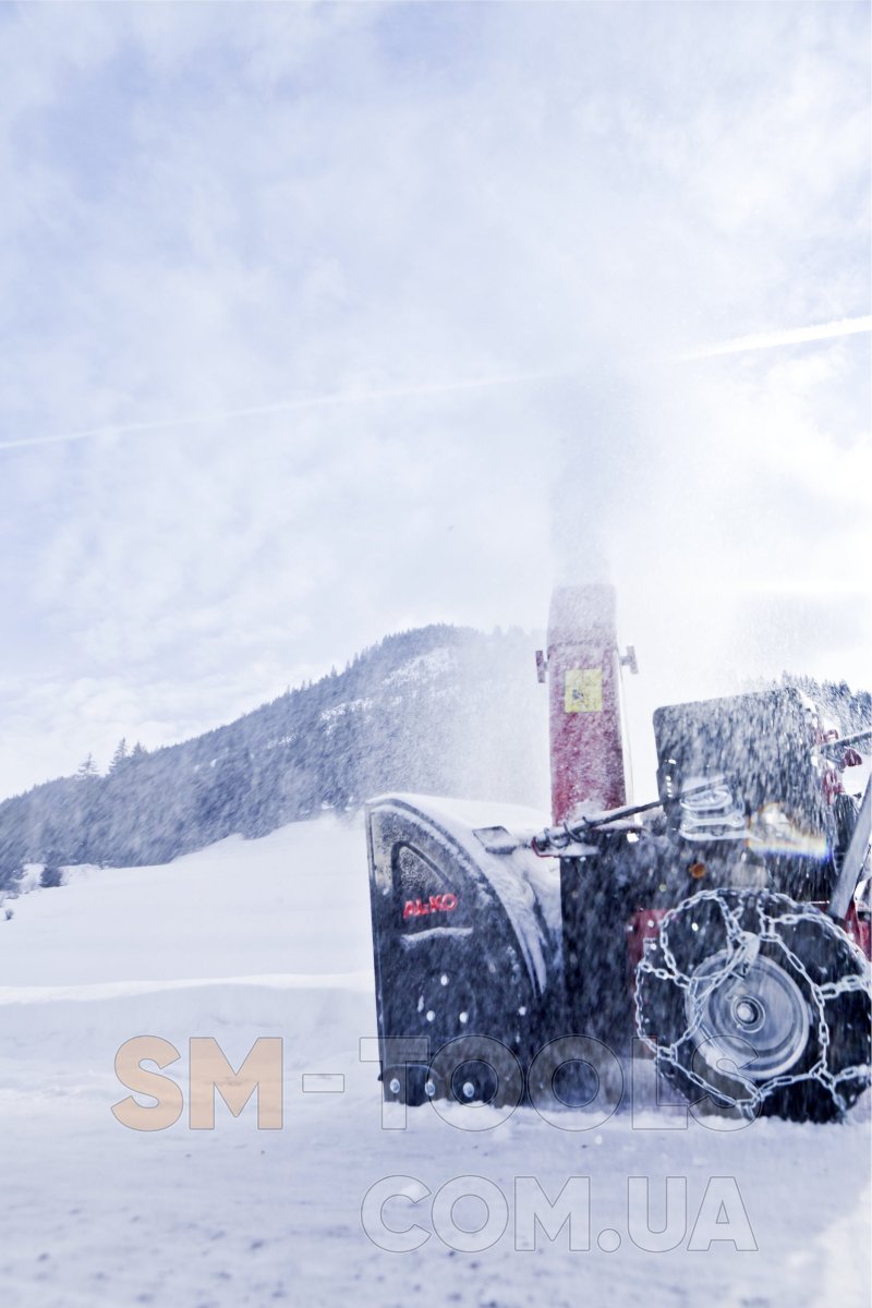 Снегоуборщик бензиновый AL-KO SnowLine 700 E это самоходная модель, маневренность которой обеспечена шинами с зимним протектором. Шесть передних передач и две задних предусматривают возможность выбора рабочего режима – тяжелый и мокрый снег убирается на высоком режиме оборотов, со свежим снегом достаточно более низких. Вес машины 118 кг, дизайнеры «одели» на снегоуборщик мощную фару и для комфорта оператора предусмотрели подогрев рукоятки.
