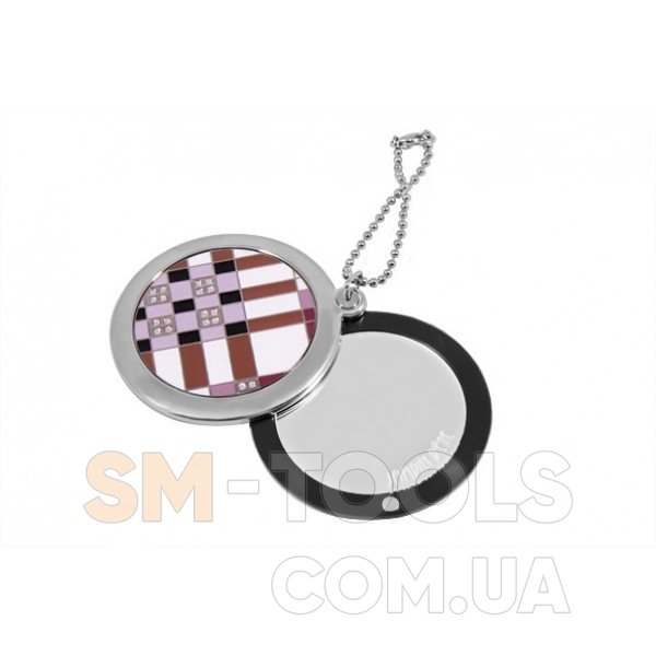Представленная здесь модель 98-0772 с корпусом из высококачественной стали, инкрустирована стразами, имеет интересный геометрический рисунок и удачную цветовую палитру с пластиковыми декоративными элементами. Нижняя створка имеет черное эмалевое покрытие. Зеркальце диаметром 45 мм открывается легким разведением его створок в разные стороны. Компактный аксессуар состоит из двух зеркал, одно из которых является стандартным, а второе – увеличивающим, и поставляется в фирменной розовой коробочке с бархатным мешочком.