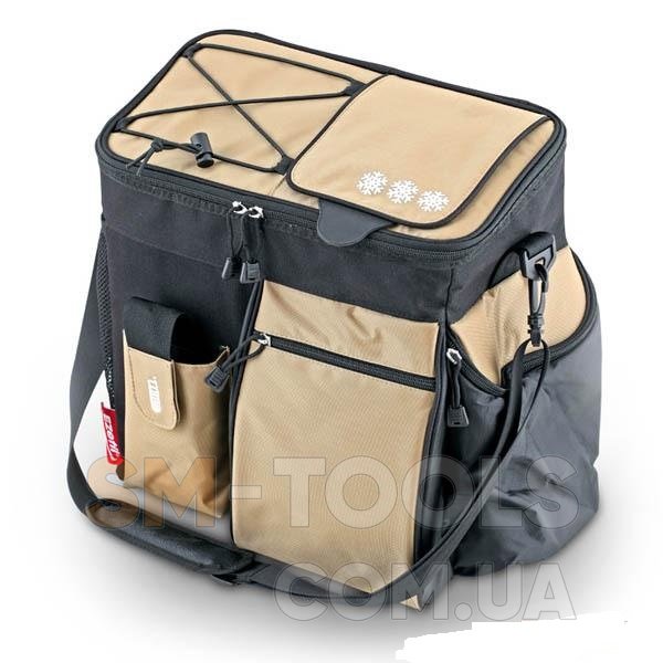 Благодаря специальному клапану осуществляется быстрый доступ к содержимому. Использование холодоаккумулятора поможет удержать прохладу внутри термосумки в течение 12 часов. Наличие карманов позволяет разложить всякие мелочи, мобильный телефон, мини-радио. Сверху предусмотрена резинка для закрепления одежды, скатерти. Переноска сумки осуществляется благодаря плечевому ремешку.