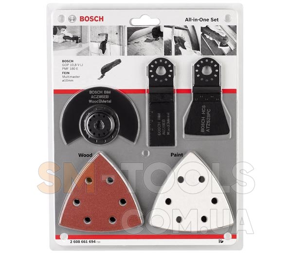 Универсальный набор для мультишлифмашины Bosch GOP/PMF (2608661694) - предназначен для широкого спектра применения при выполнении пиления дерева и металла, шлифовании различных поверхностей, снятия, при помощи шаберных насадок, остатков покрытий.
