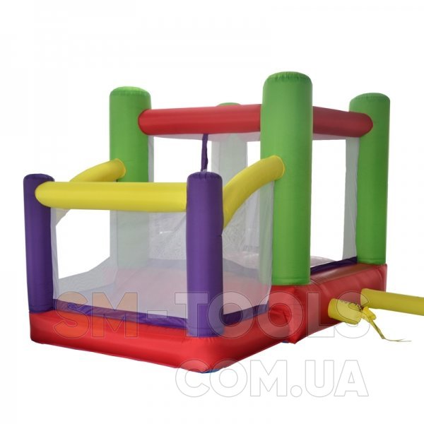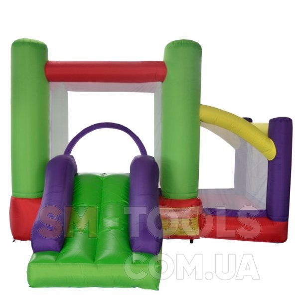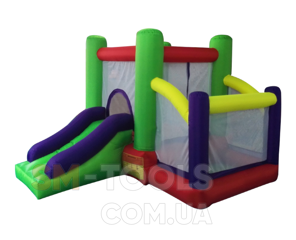 Этот надувной батут имеет два отделения и горку, выполненный в различных, ярких цветах.