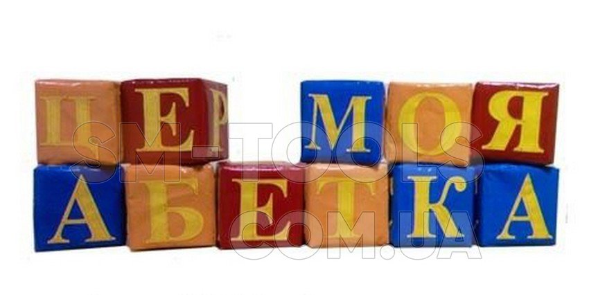 Набор состоит из 12 кубиков, на сторонах кубика размещены 72 буквы украинского алфавита, количество букв позволяют ребенку самостоятельно составлять слова и словосочетания.