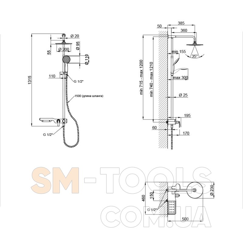 Высота душевой стойки, мм: 715-1200