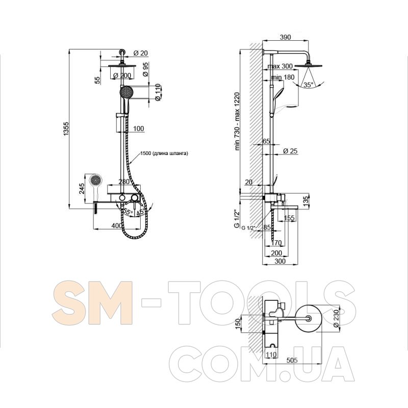 Диаметр лейки, мм: Ручной душ: 110. Верхний душ: 230